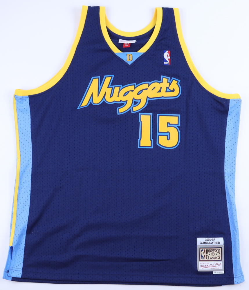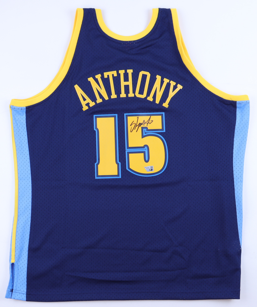 Mitchell & Ness jersey with everything pressed on, size L. Jersey has been hand-signed by Carmelo Anthony (Denver Nuggets).