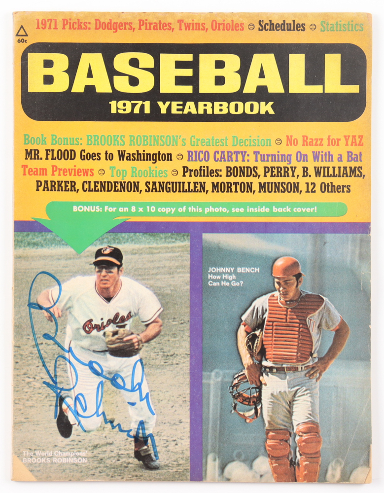 "Baseball 1971 Yearbook" magazine. Hand-signed on the front cover by Brooks Robinson (D. 2023, Baltimore Orioles, HOF). Please refer to photos for more details on the condition of the item.