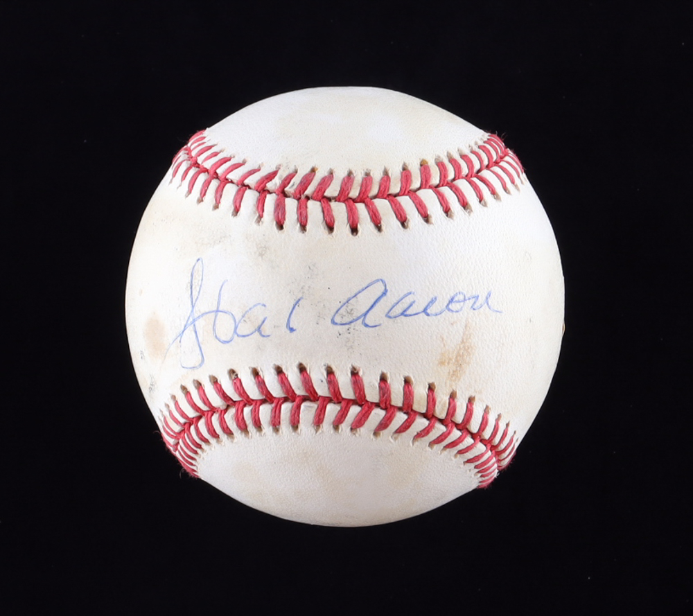 Rawlings Official National League Baseball has been hand-signed by Hank Aaron (D. 2021, Milwaukee / Atlanta Braves, HOF).