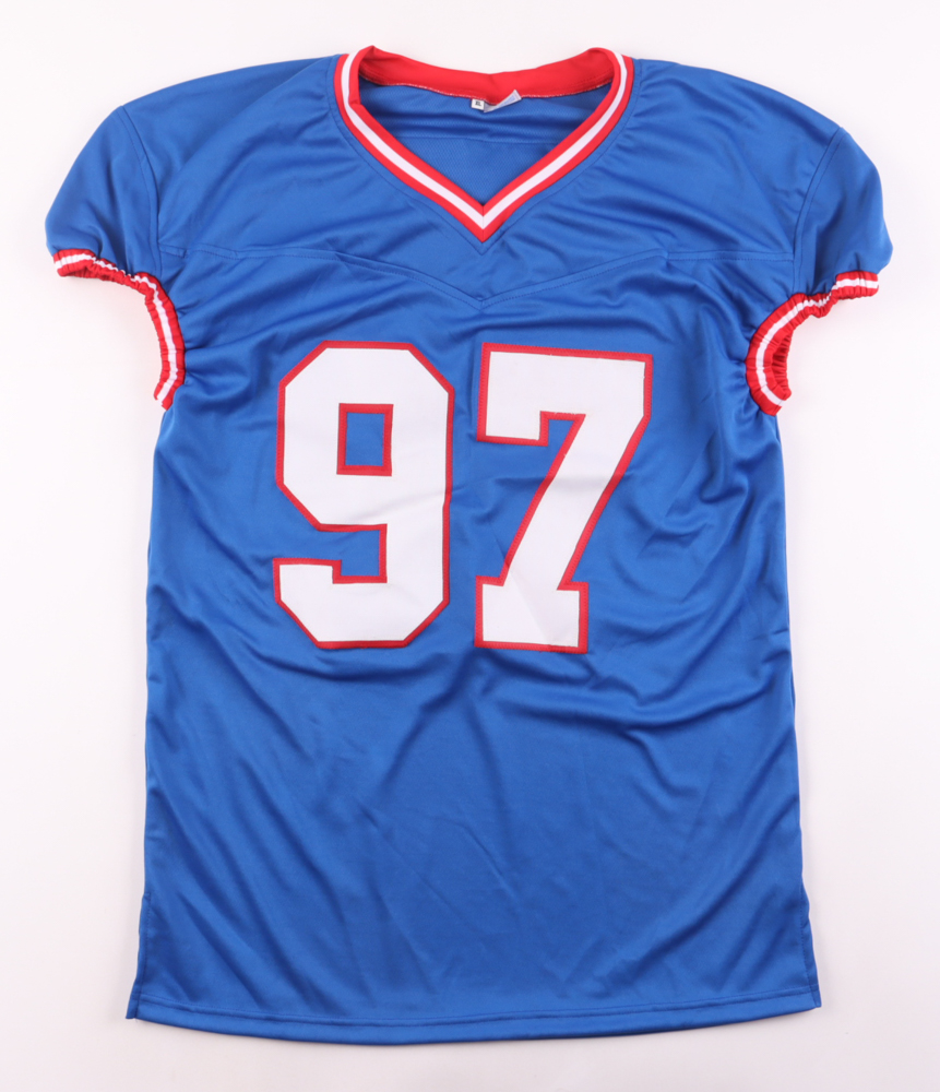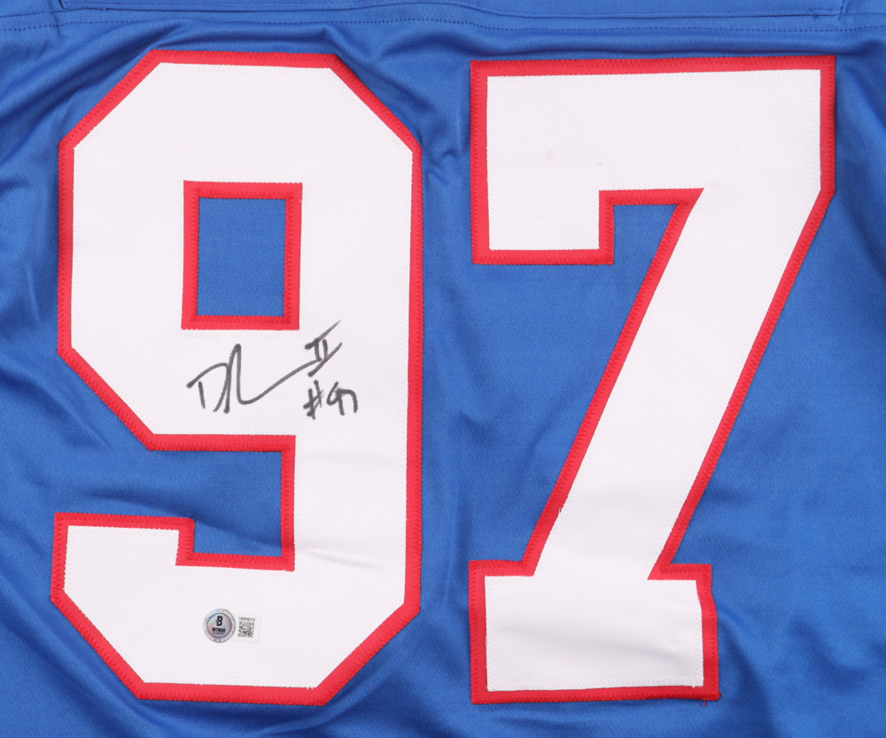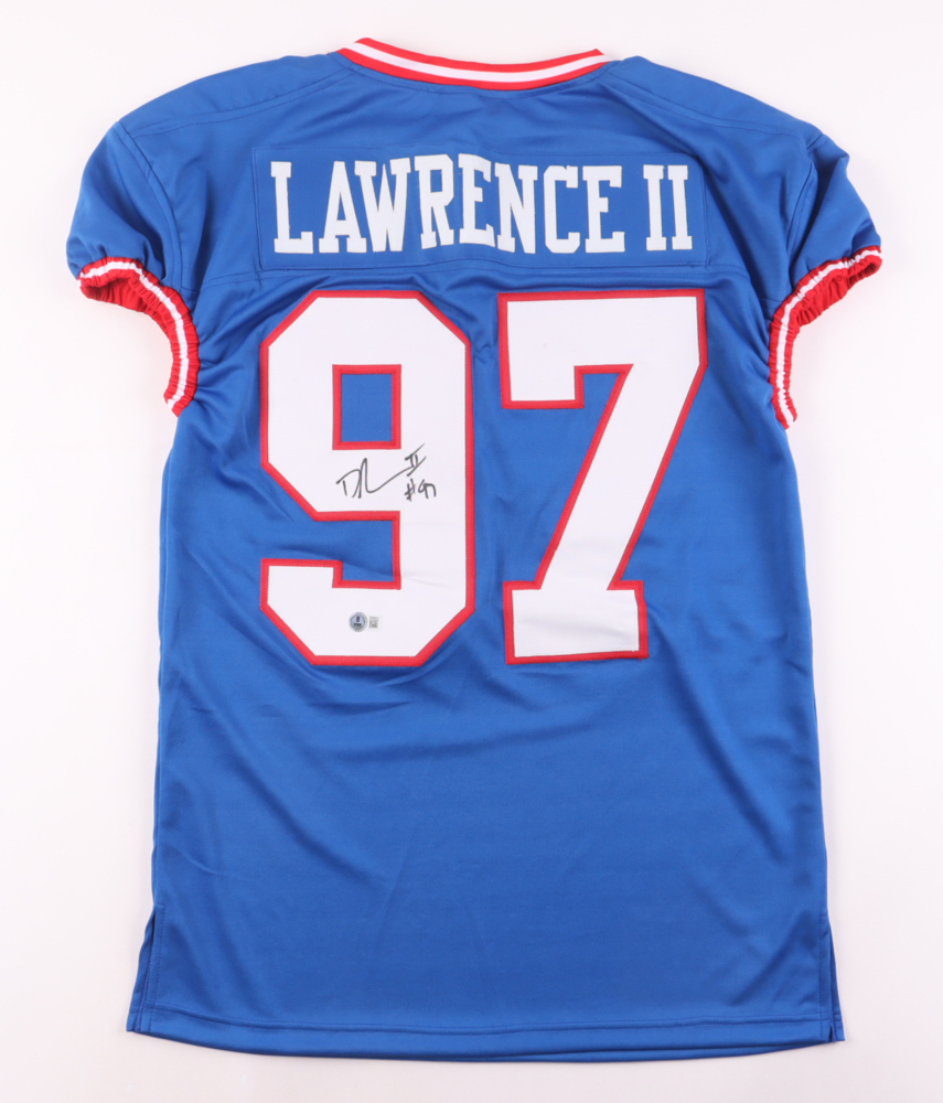 Custom jersey with everything sewn on, size XL. Hand-signed by Dexter Lawrence. Please note, there is a stain on the reverse number.