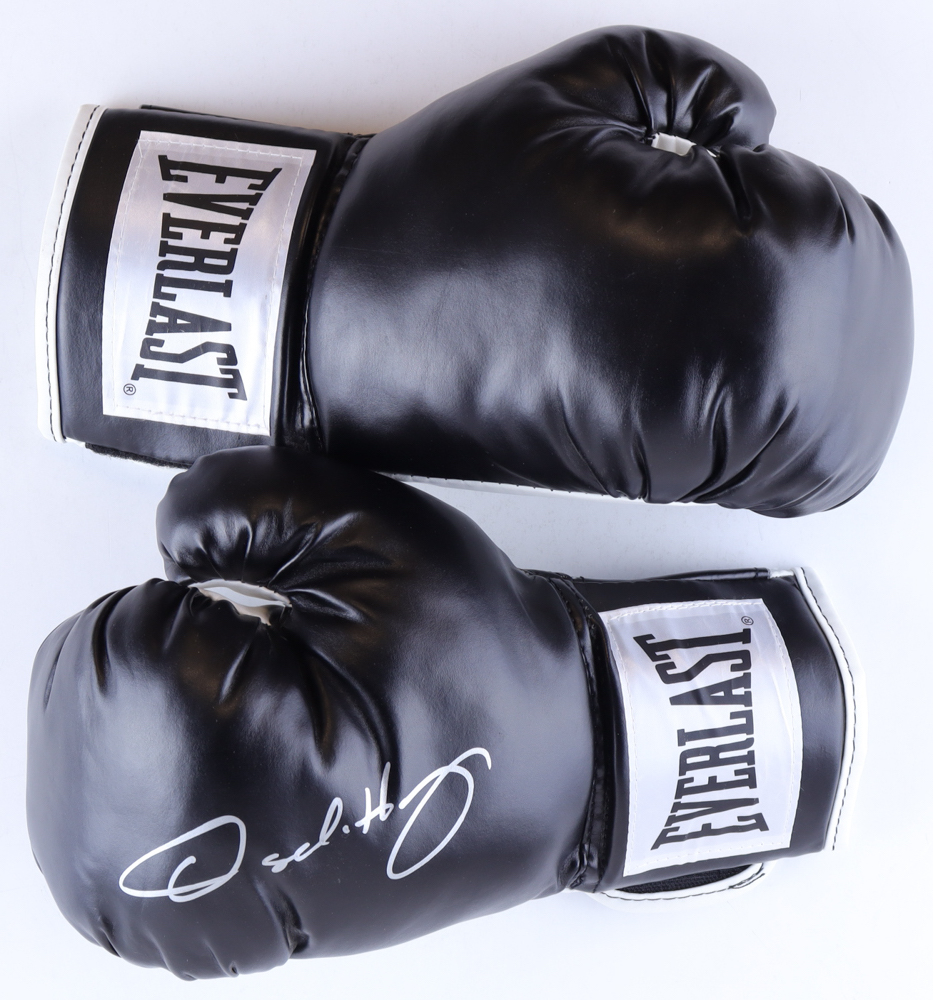 Set of Everlast black boxing gloves has been hand-signed on the left glove by Oscar De La Hoya. See photos for more details.