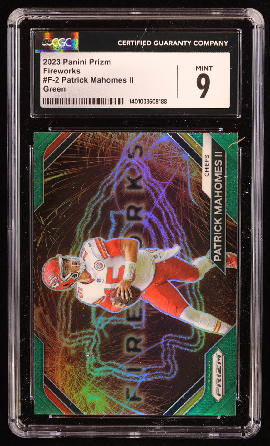 Patrick Mahomes II 2023 Panini Prizm Fireworks Prizms Green #2 (CGC 9)