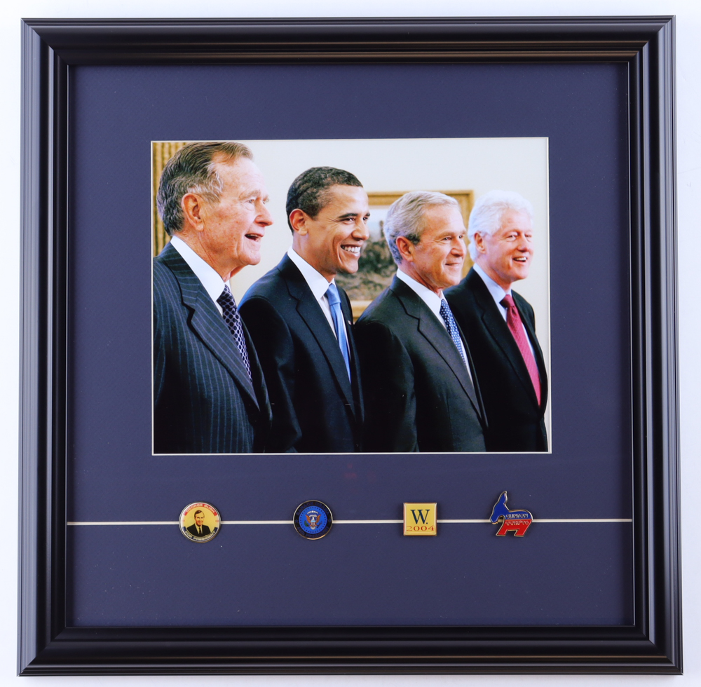"Four Presidents in the Oval Office" Custom Framed Photo Display with (4) Presidential Campaign Pins for George Bush Sr., Barack Obama, George Bush Jr., & Bill Clinton