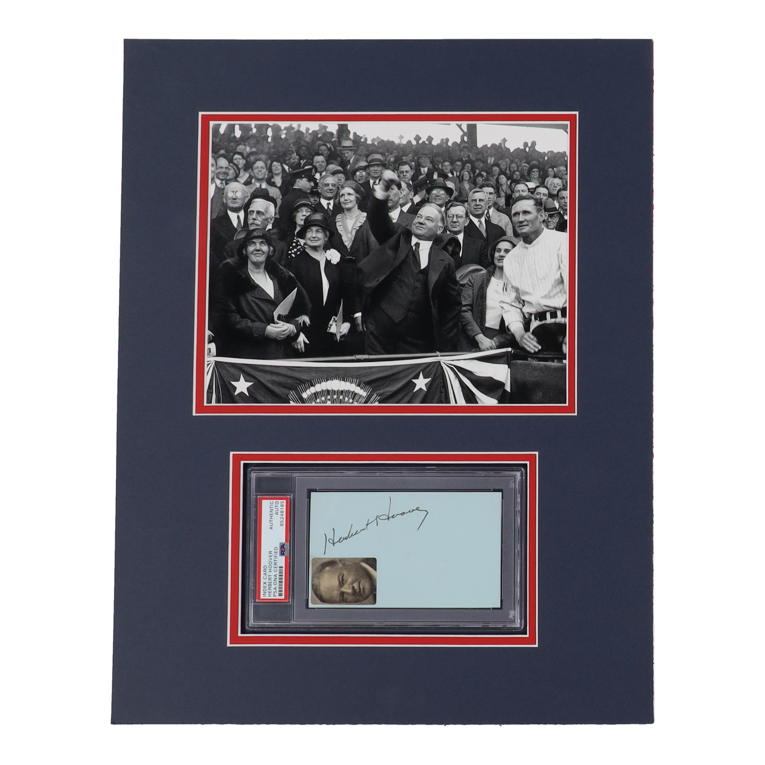 Custom matting measures 14" x 18" in size. Features an index card that has been hand-signed by Herbert Hoover (D. 1964).