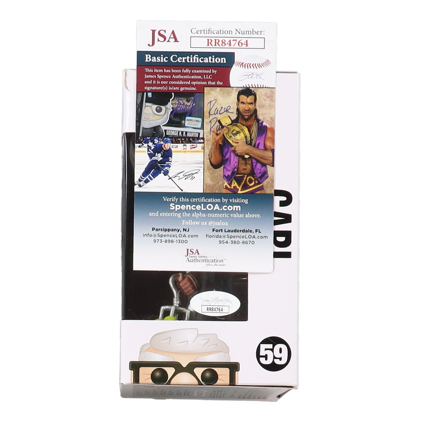 Vinyl figure measures approximately 4" tall and has been hand-signed and inscribed on the packaging by Ed Asner (D. 2021). Please note, there are tears on the corners and creases throughout the packaging.