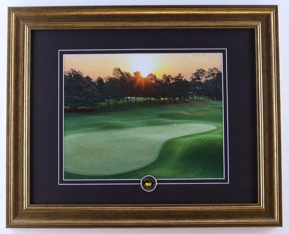 Custom frame measures approximately 13.25" x 16.25" in size and features an unsigned course photo as well as an official Masters Tournament pin.