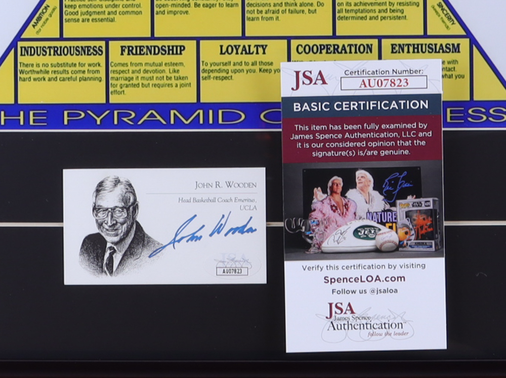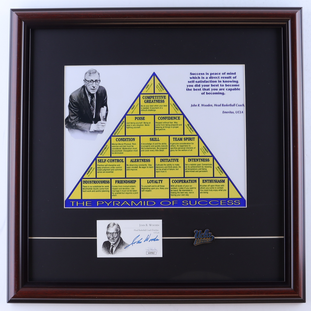 John Wooden Signed "The Pyramid of Success" Custom Framed Business Card with UCLA Bruins Vintage Lapel Pin (JSA)