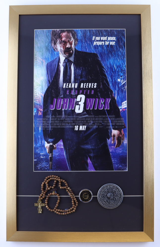 "John Wick Chapter 3" Custom Framed Movie Poster Display with Adjudicator Coin, Rosary with Religious Cross & Blood Oath Marker