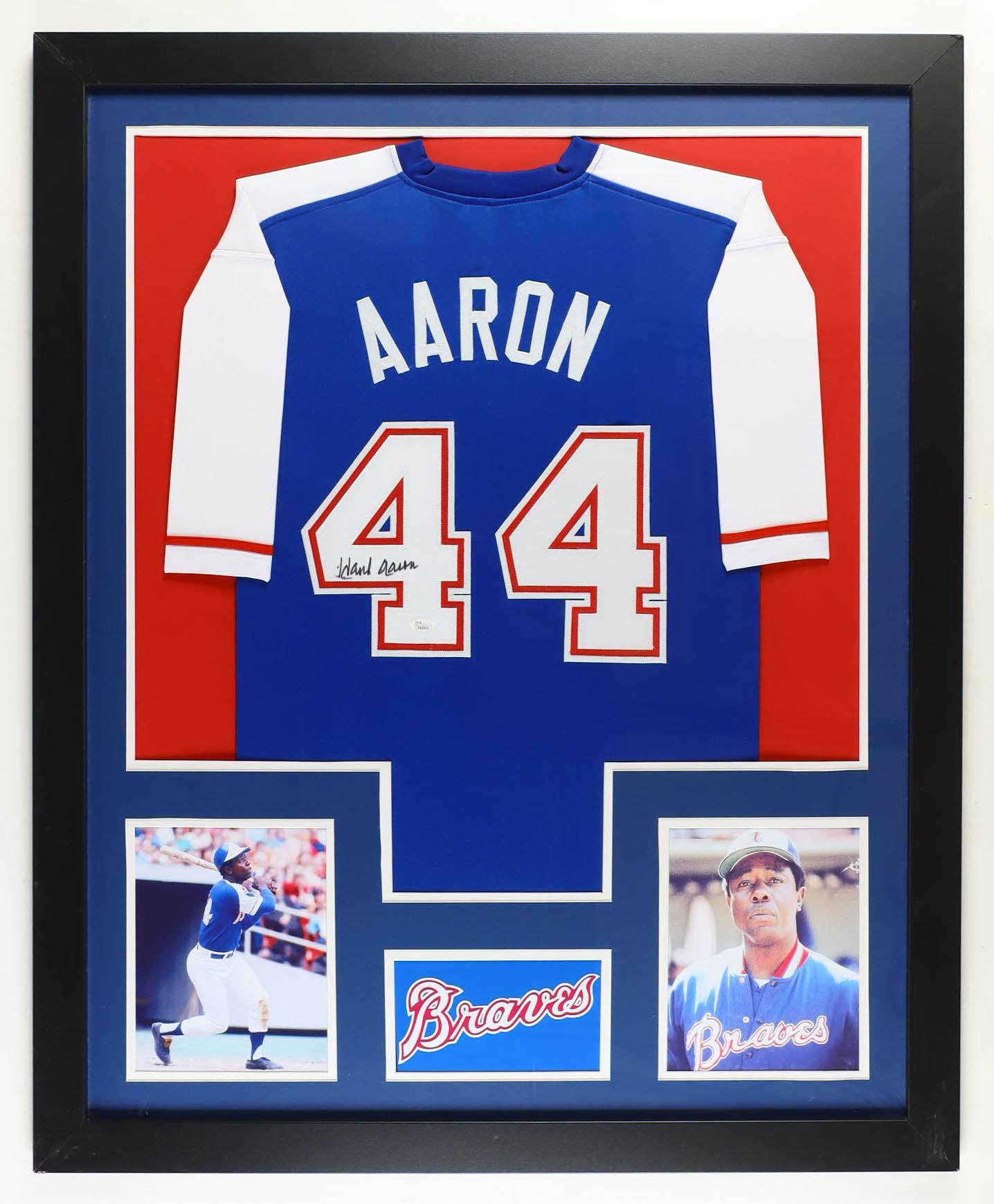 Custom frame measures 35.5" x 43.5" in size and features a jersey that has been hand-signed by MLB legend, Hank Aaron!