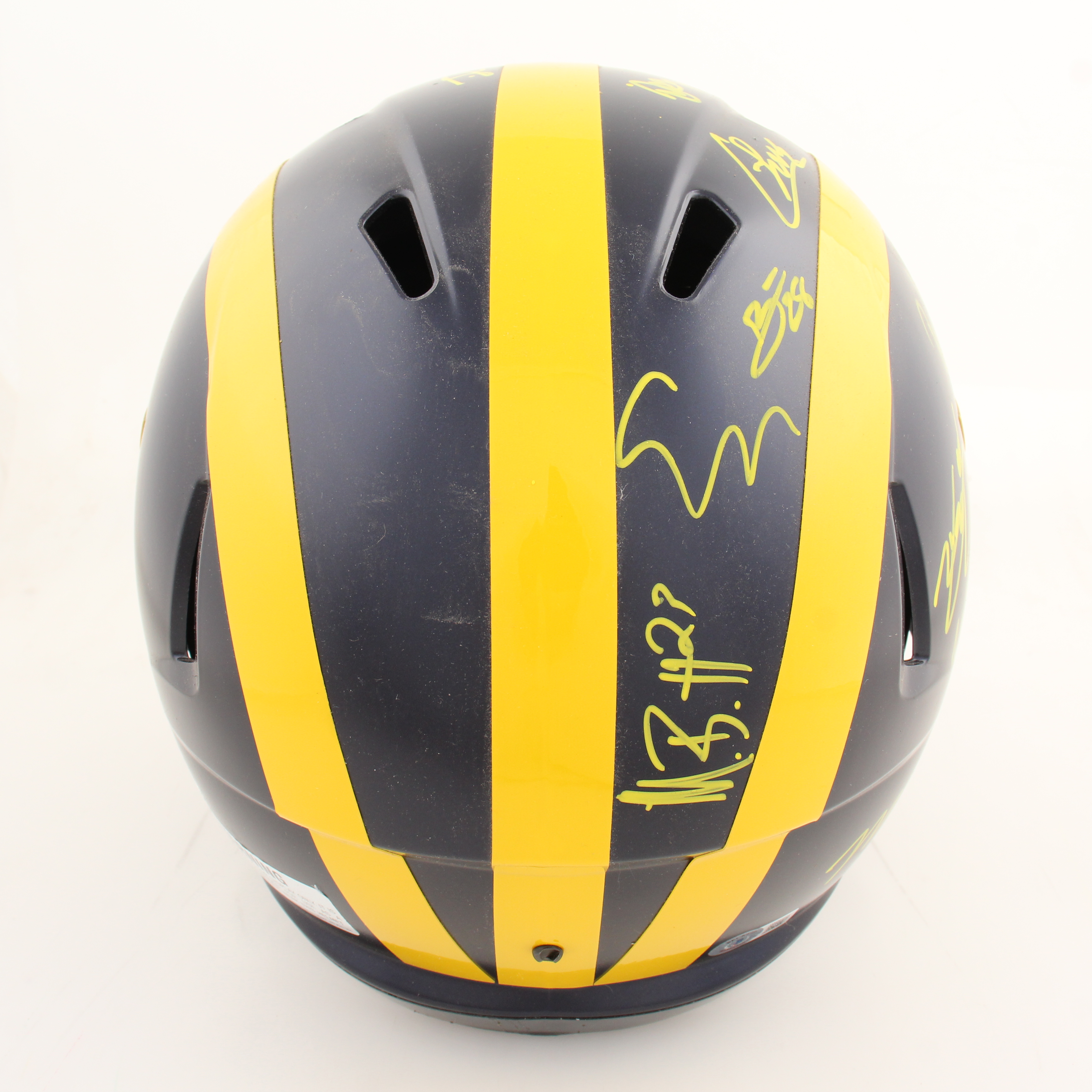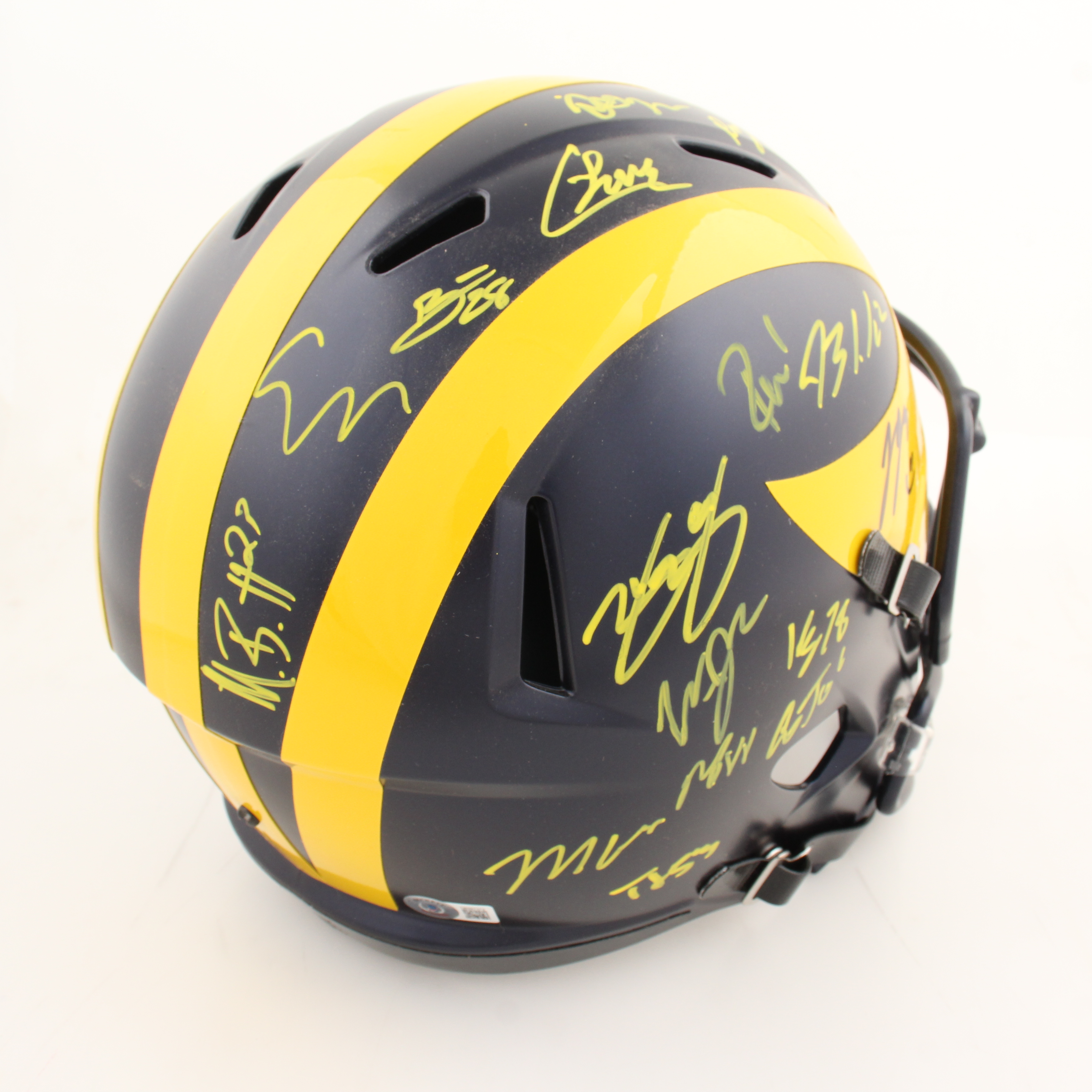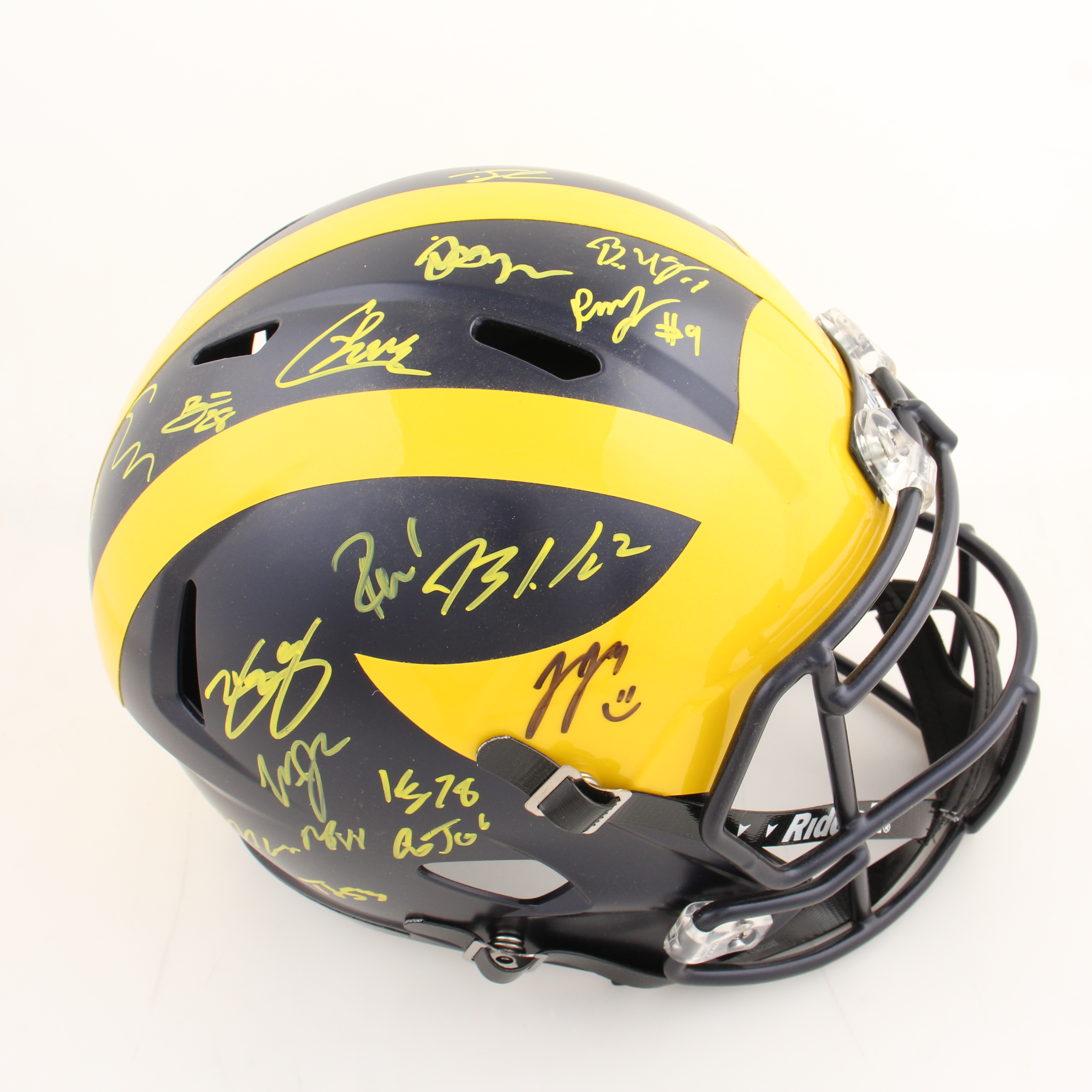 Riddell Michigan Wolverines full-size replica Speed helmet. Hand-signed by (18), with J.J. McCarthy, Mike Barrett, Max Bredeson, Junior Colson, Blake Corum, Mason Graham, Kenneth Grant, Benjamin Hall, Jaylen Harrell, Cornelius Johnson, Will Johnson, Trente Jones, Colston Loveland, Braiden McGregor, Rod Moore, Semaj Morgan, Roman Wilson, and Zak Zinter.