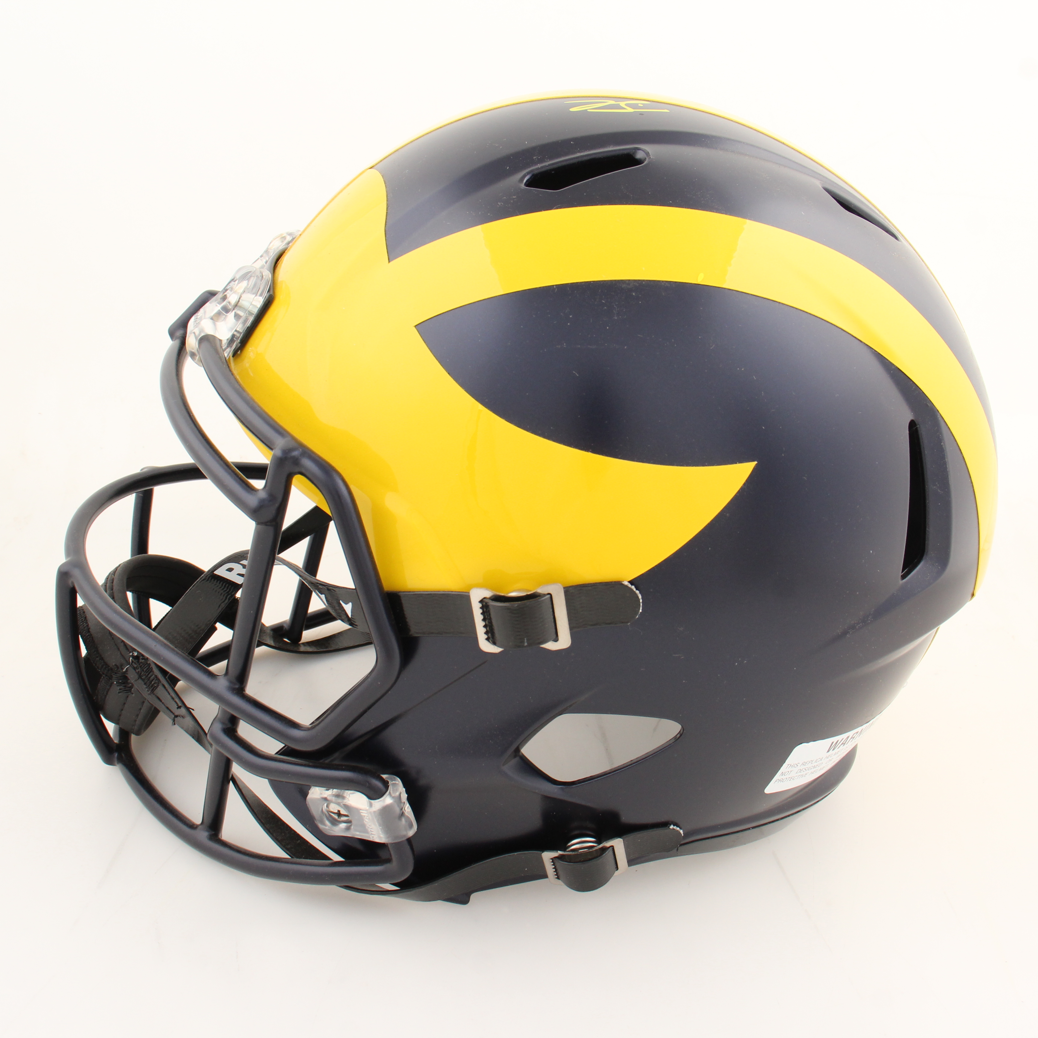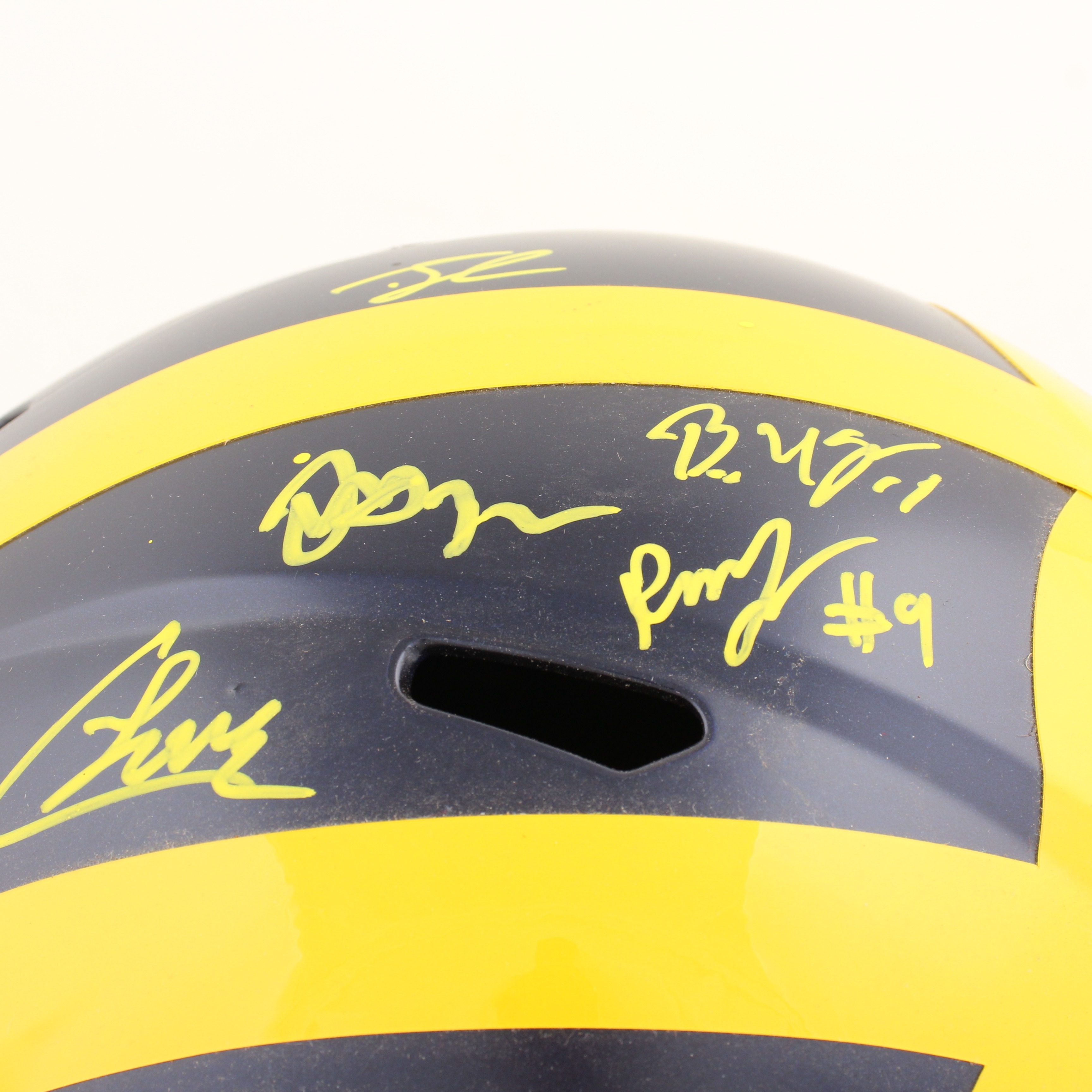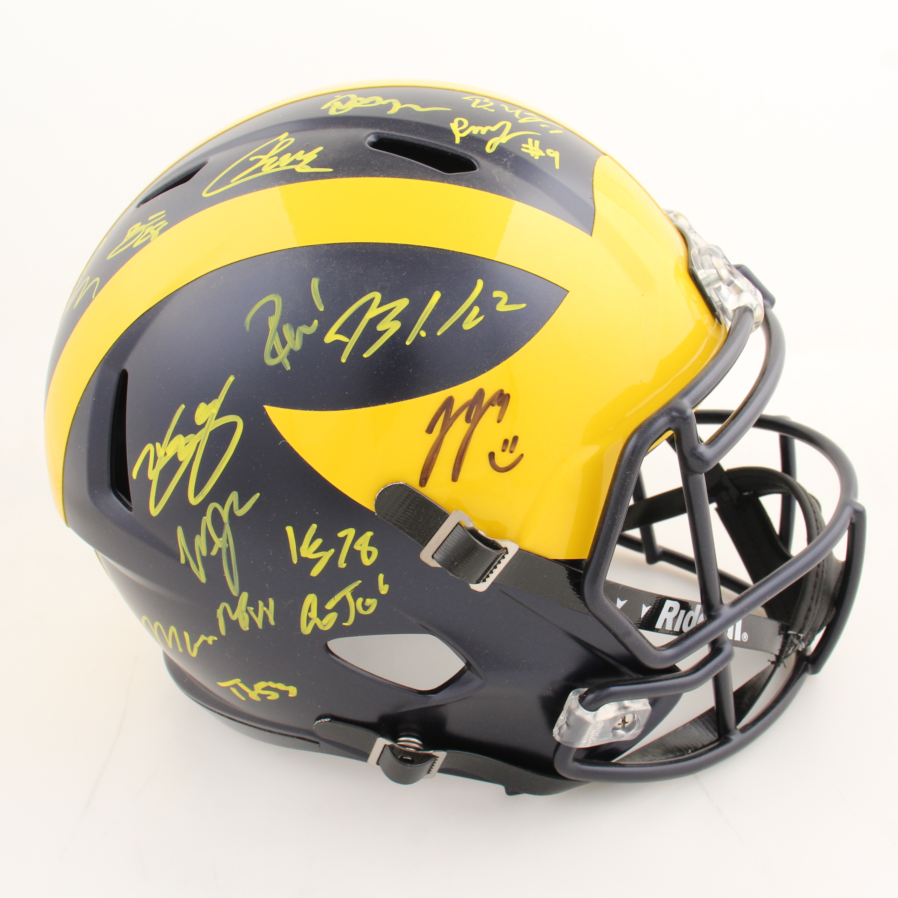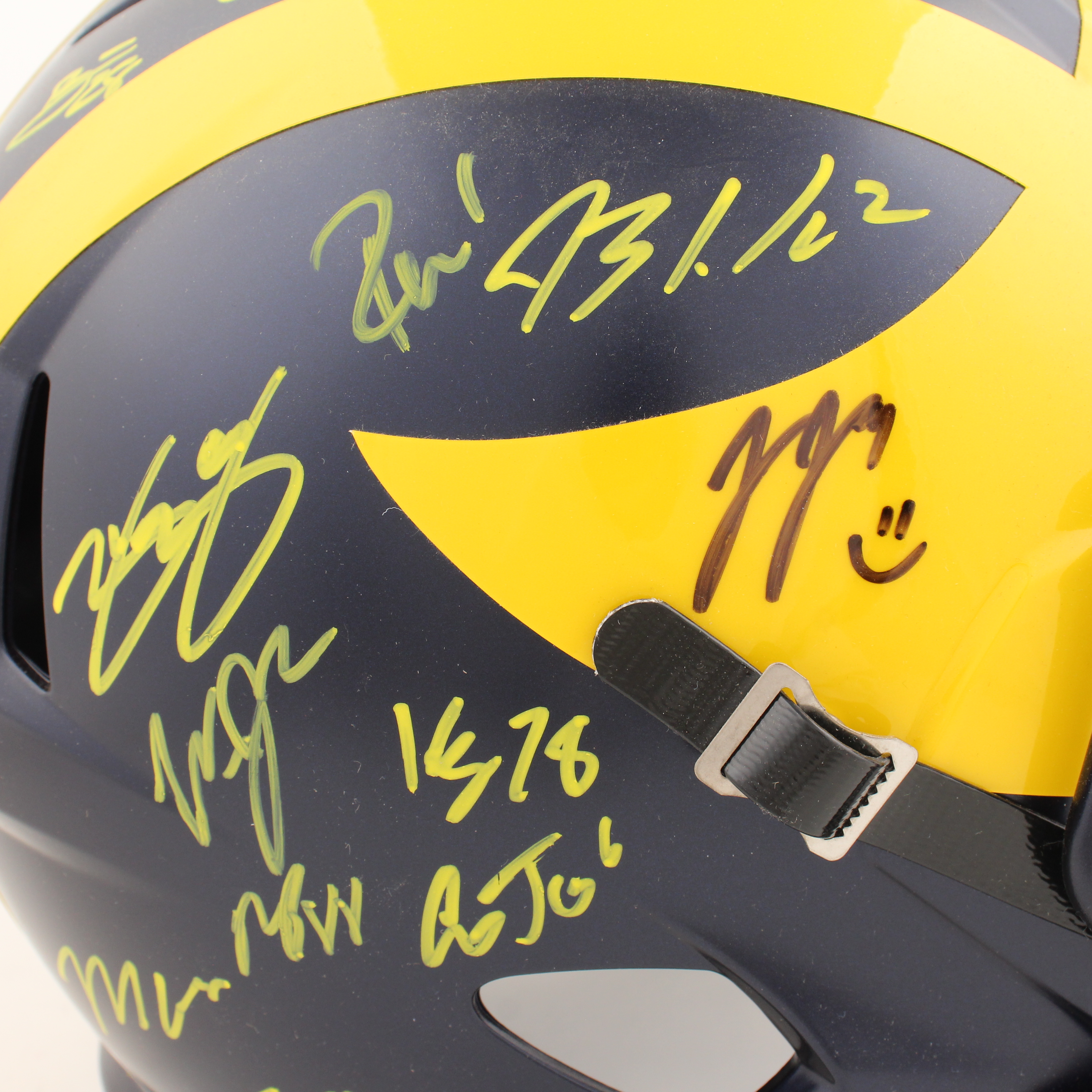 Riddell Michigan Wolverines full-size replica Speed helmet. Hand-signed by (18), with J.J. McCarthy, Mike Barrett, Max Bredeson, Junior Colson, Blake Corum, Mason Graham, Kenneth Grant, Benjamin Hall, Jaylen Harrell, Cornelius Johnson, Will Johnson, Trente Jones, Colston Loveland, Braiden McGregor, Rod Moore, Semaj Morgan, Roman Wilson, and Zak Zinter.