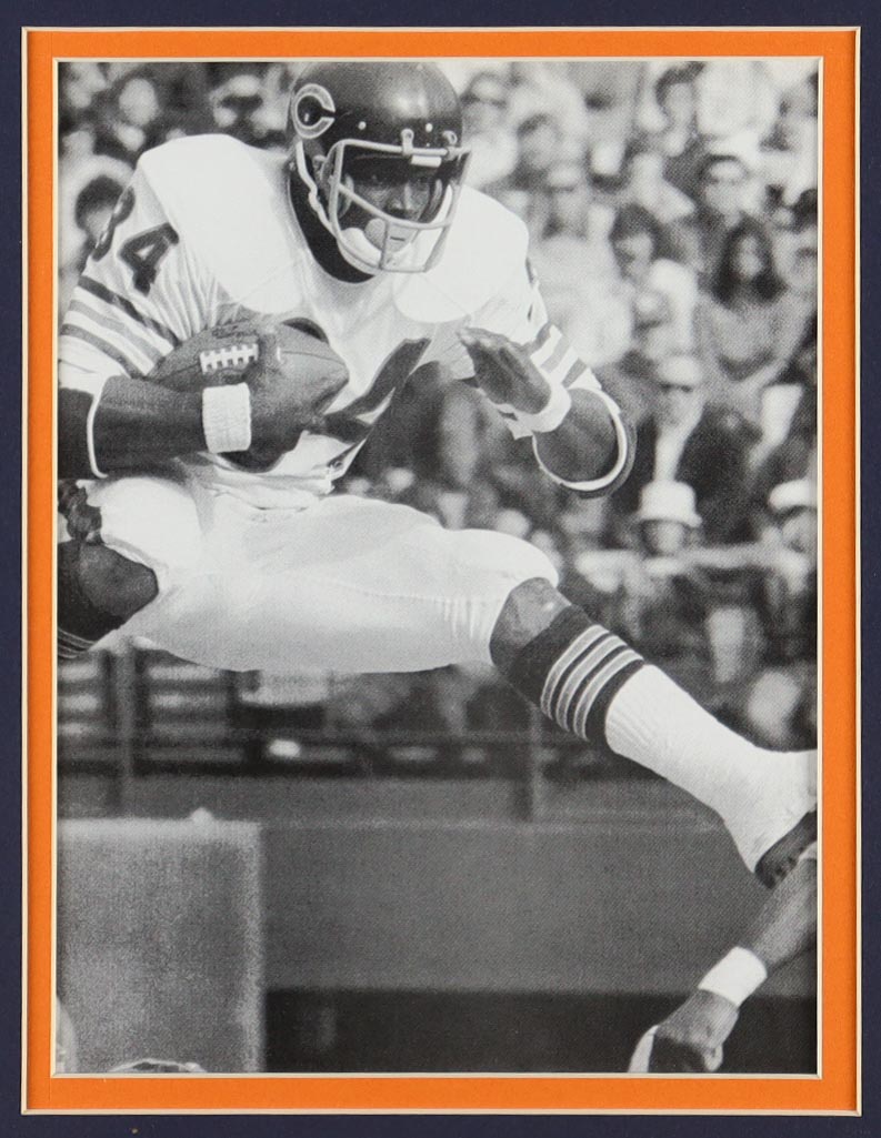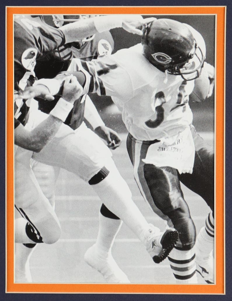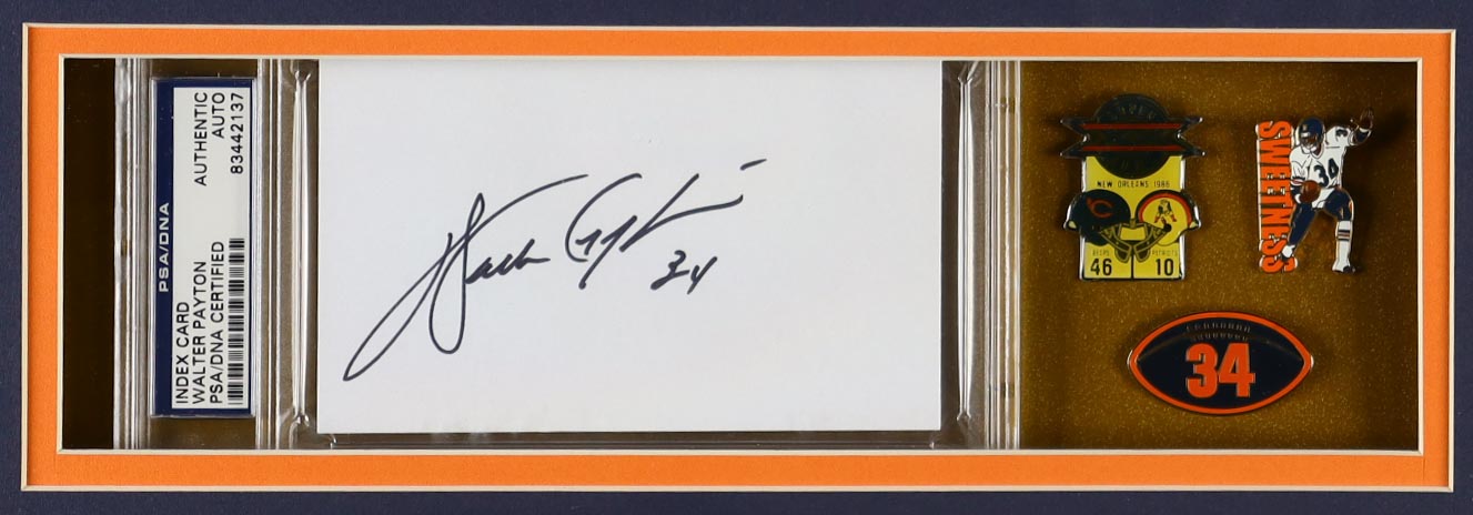 Custom frame measures approximately 32" x 36" in size and features a cut that has been hand-signed by Walter Payton (D. 1999, Chicago Bears, HOF). The display also includes an unsigned jersey, Super Bowl XX, Sweetness, Retirement Pins, and (2) cloth logo patches.