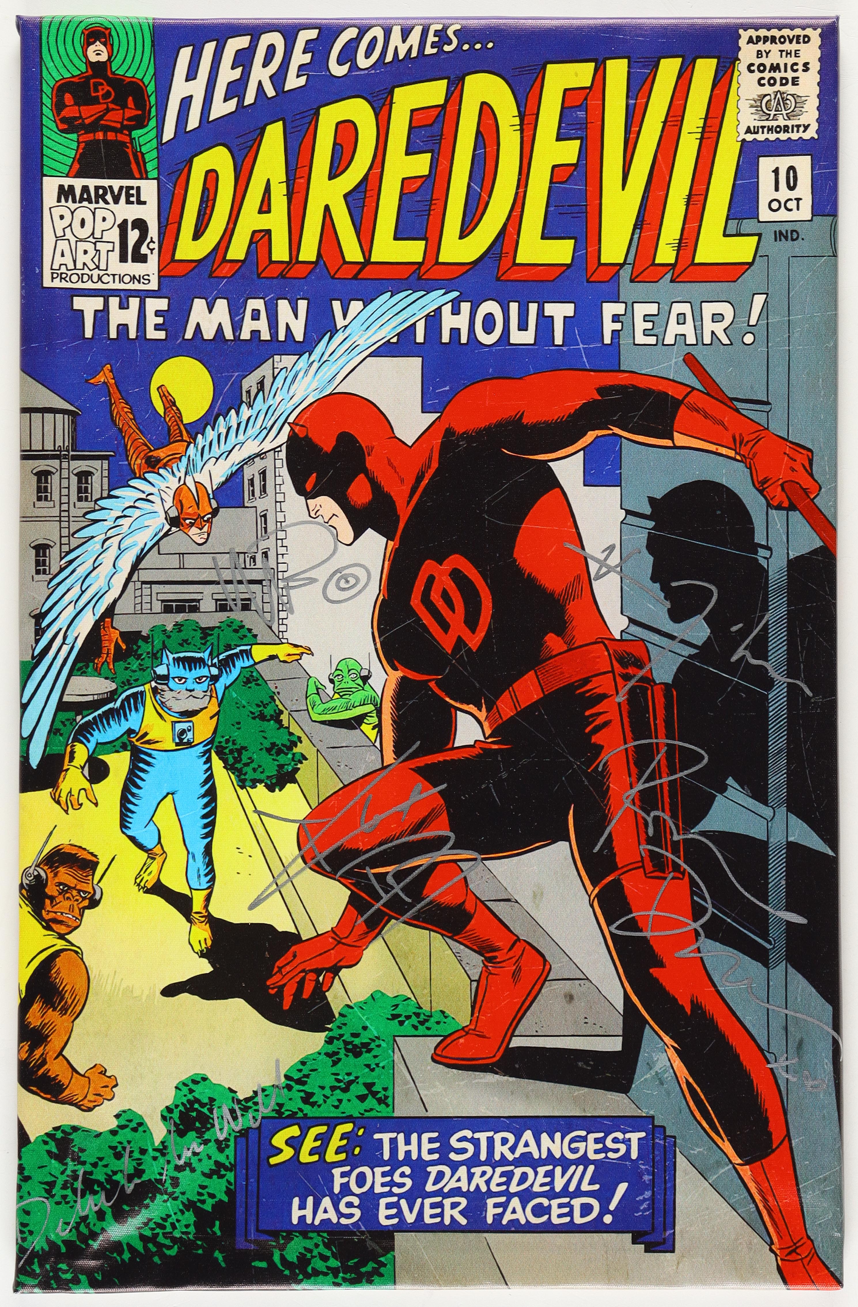 Canvas print measures approximately 14.5" x 22.5" in size and has been hand-signed by (5), with Charlie Cox (Matt Murdock / Daredevil), Rosario Dawson (Claire Temple), Vincent D'Onofrio (Wilson Fisk / Kingpin), Wilson Bethel (Benjamin "Dex" Poindexter), and Deborah Ann Woll (Karen Page).