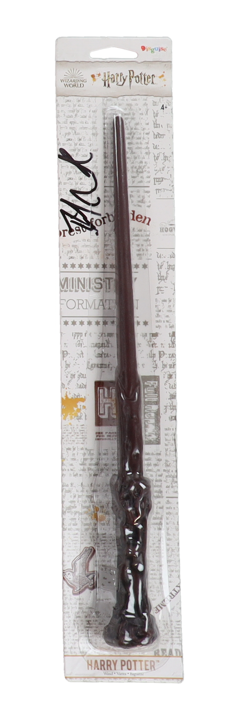 Toy wand packaging measures approximately 3" x 16.5" in size and has been hand-signed by Daniel Radcliffe.