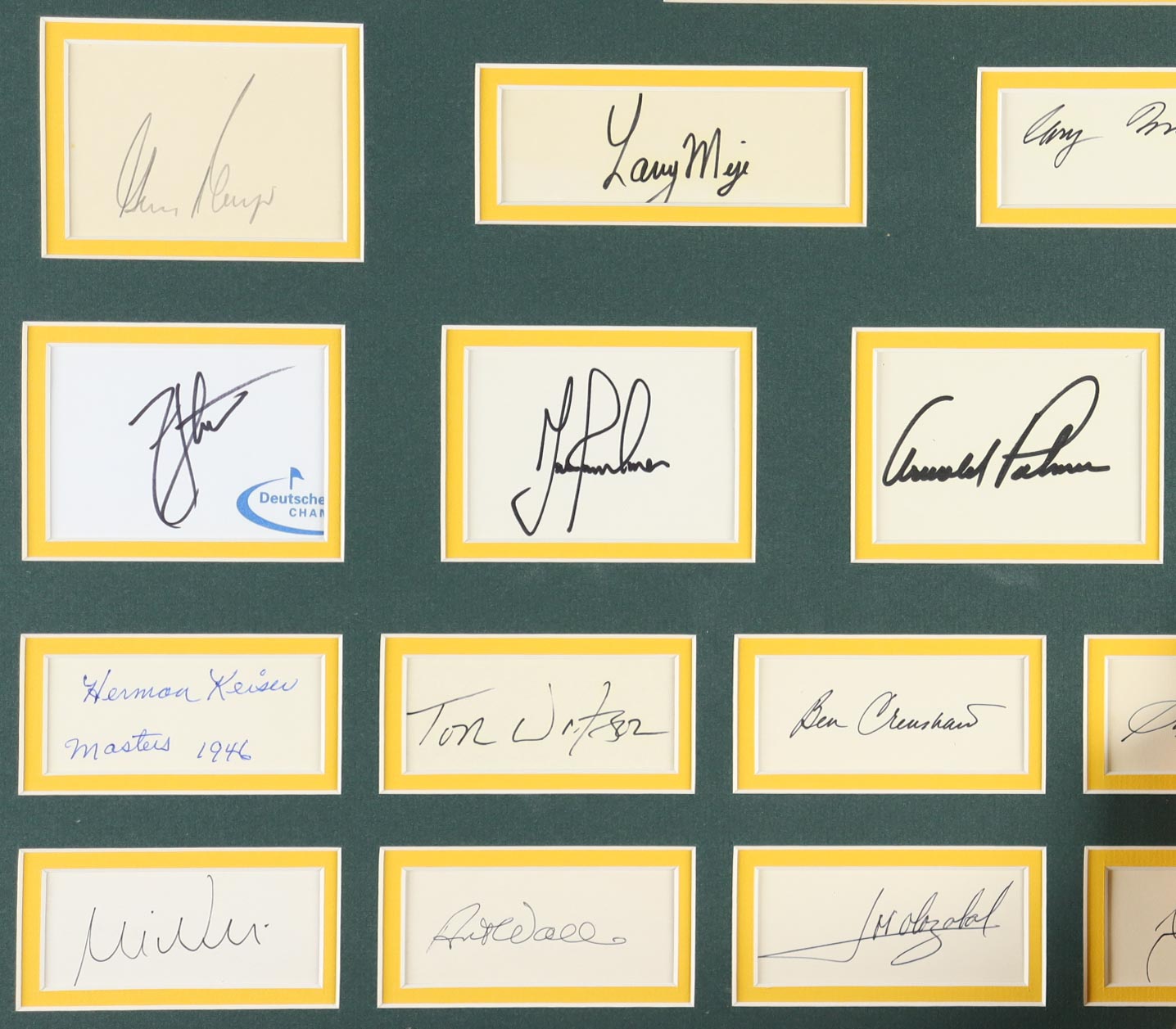 Custom frame measures approximately 34" x 44" in size. Hand-signed by Arnold Palmer, Gary Player, Mark O'Meara, Vijary Singh, Billy Casper, Cary Middlecoff, Doug Ford, Adam Scott, Ben Crenshaw, Zach Johnson, Charles Coody, Larry Mize, Tommy Aaron, Gene Sarazen, Jack Burke Jr., George Archer, Bob Goalby, Raymond Floyd, Tom Watson and (18) others.