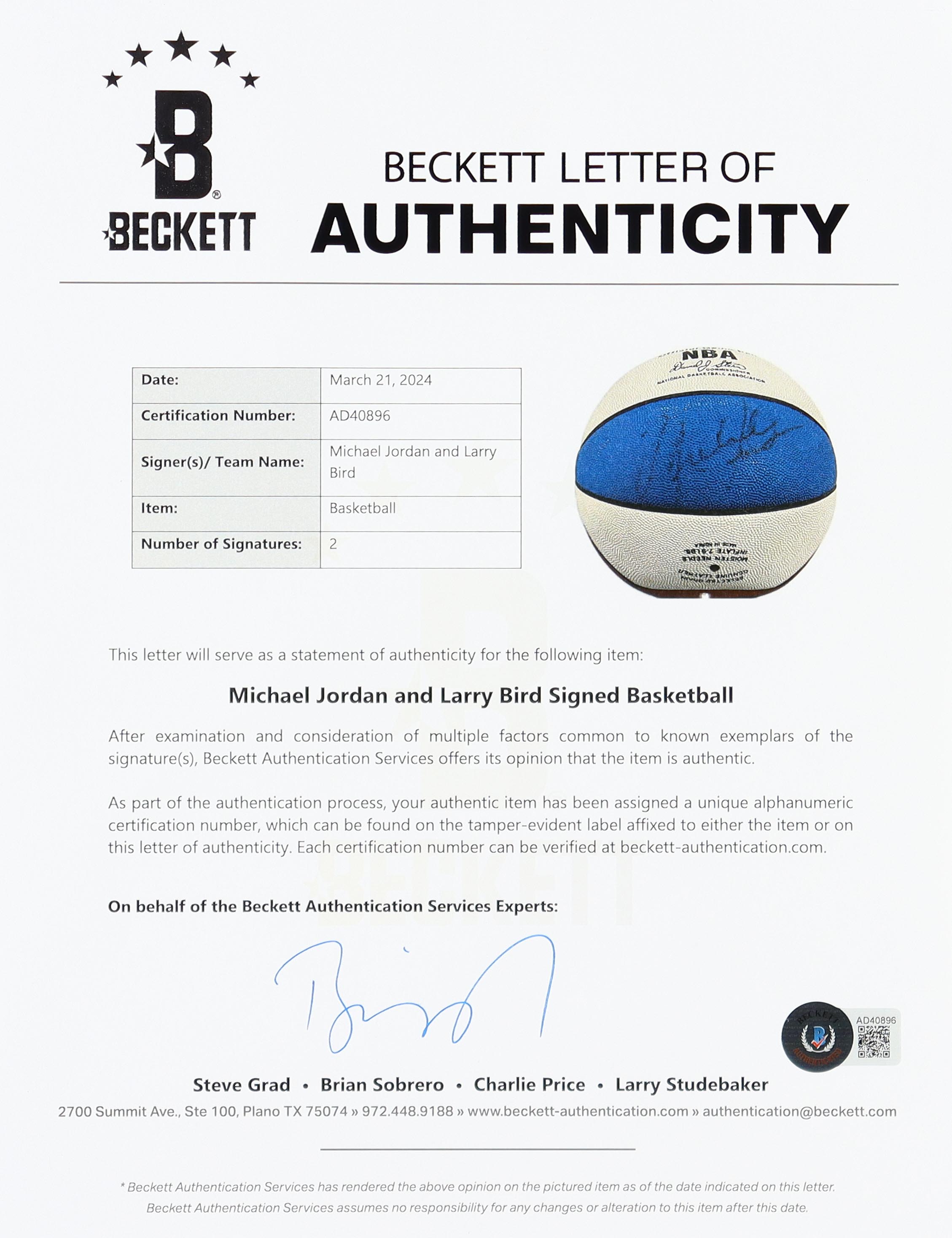 The ball includes an official Beckett Authentication Services hologram and matching LOA for authenticity purposes.