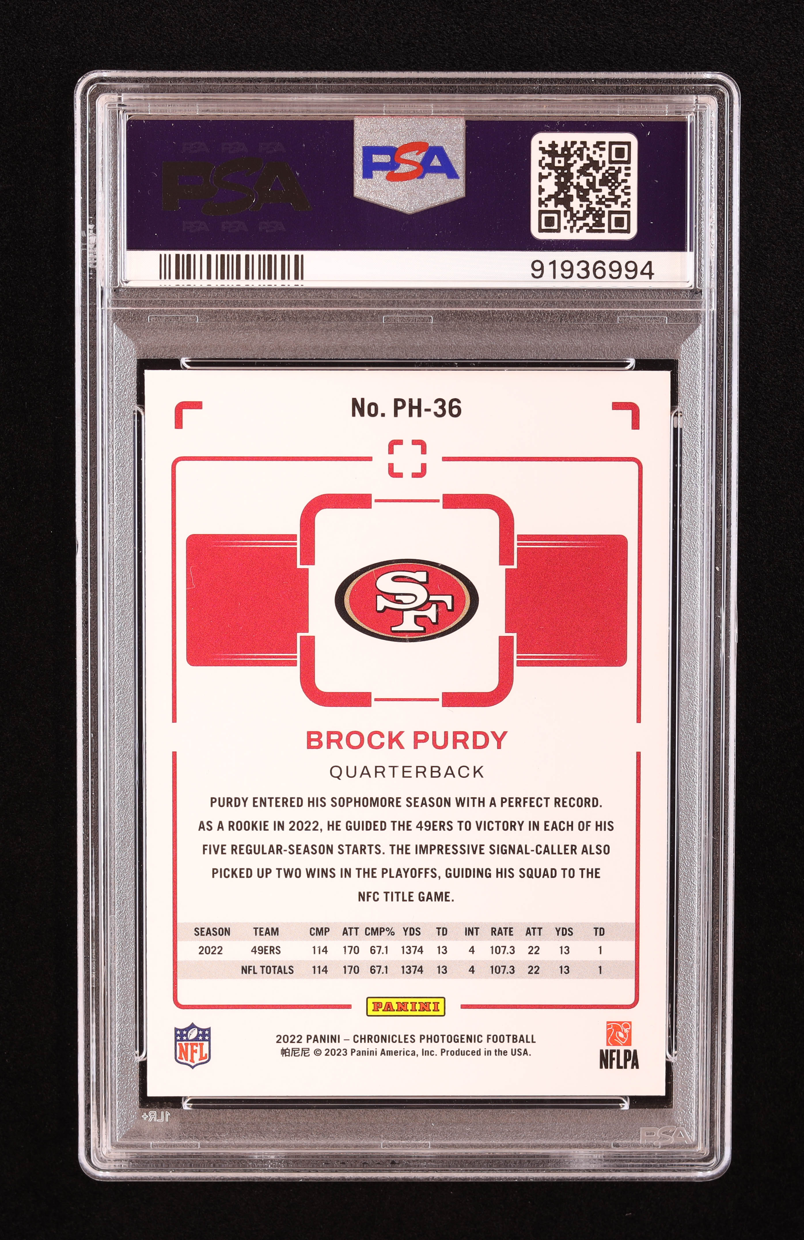 Brock Purdy 2022 Panini Chronicles Photogenic #36 RC (PSA 8)