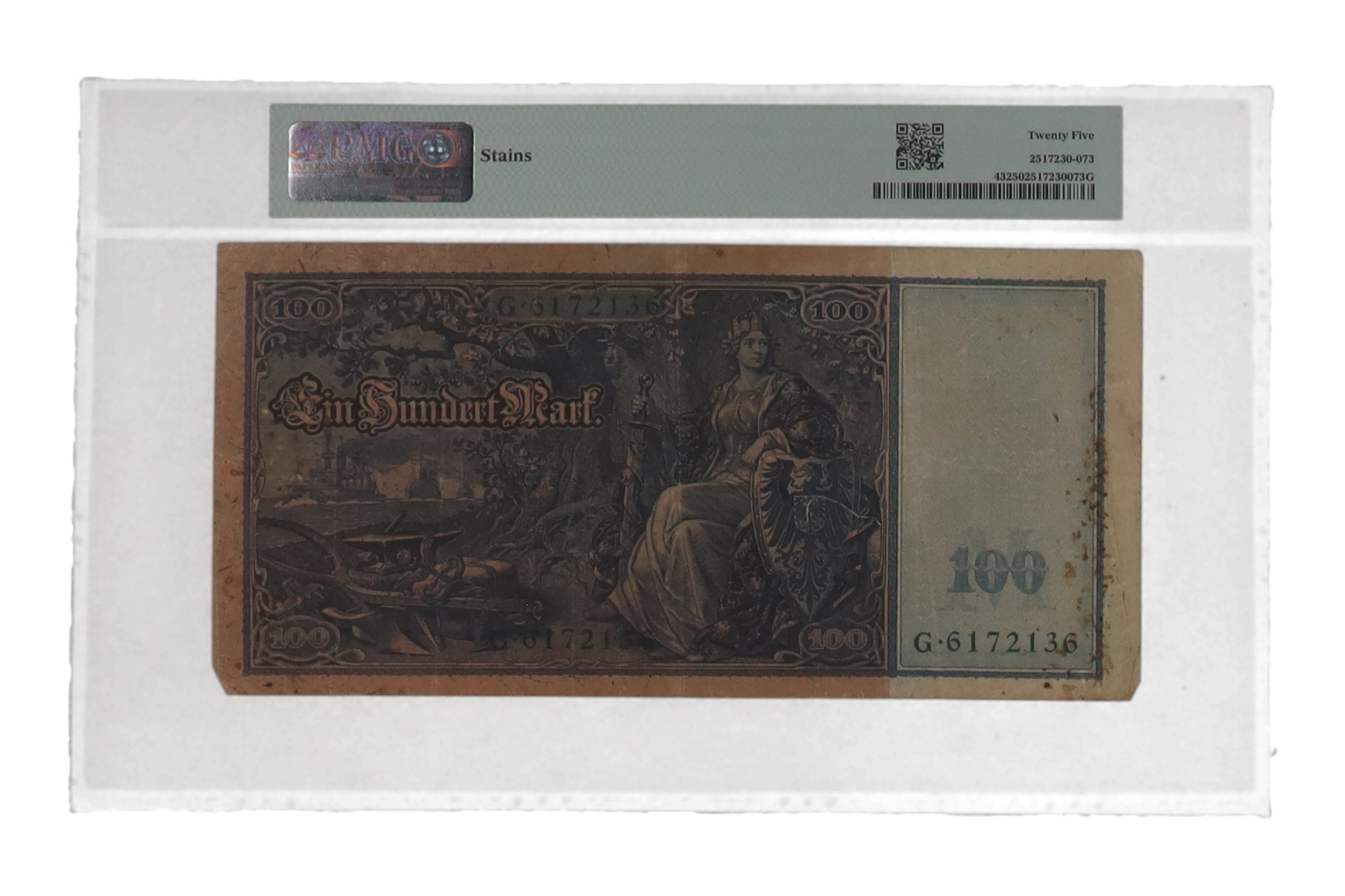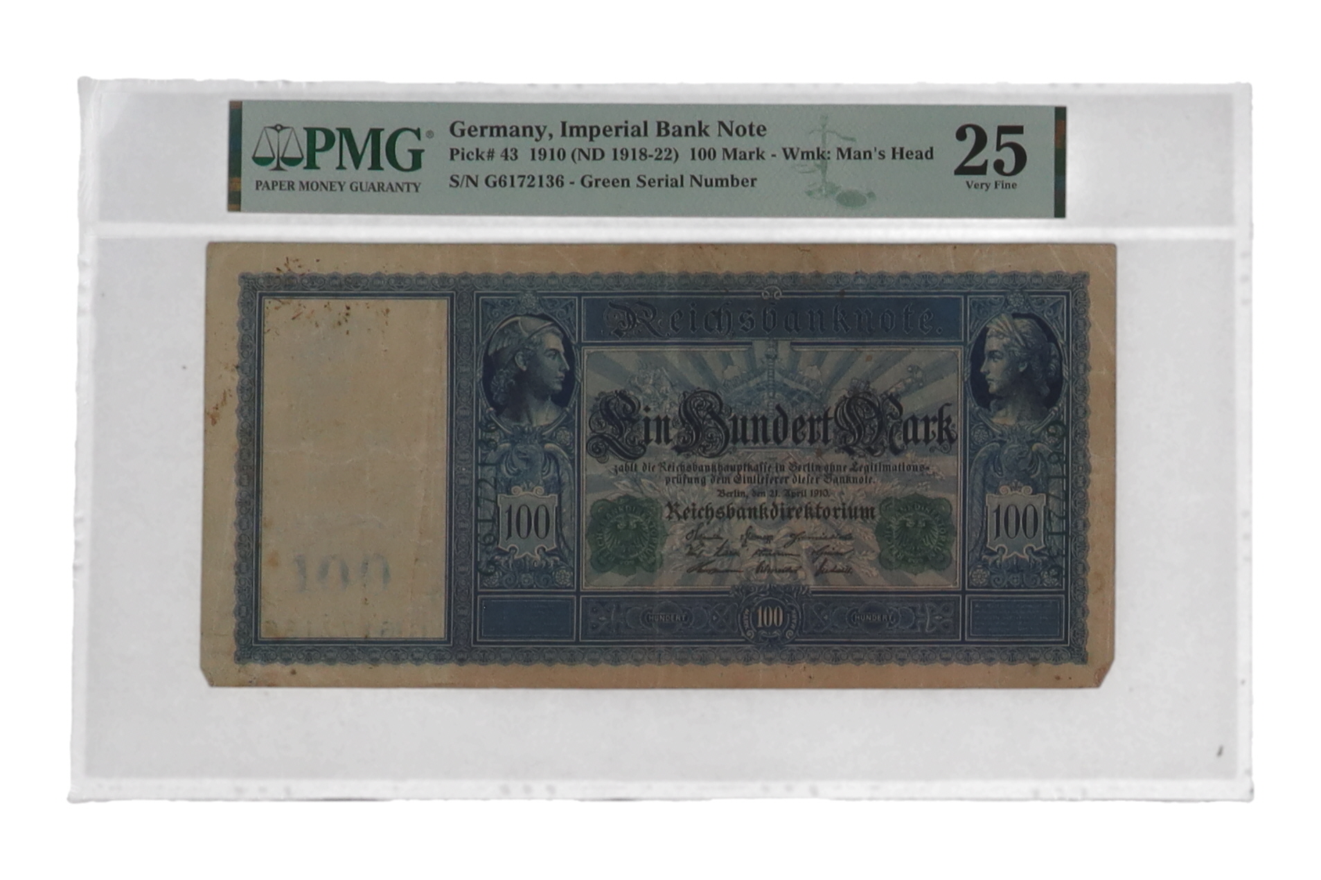1910 Germany, Imperial Bank Note - 100 Mark Reichsbanknote - Green Serial Number (PMG VF25)