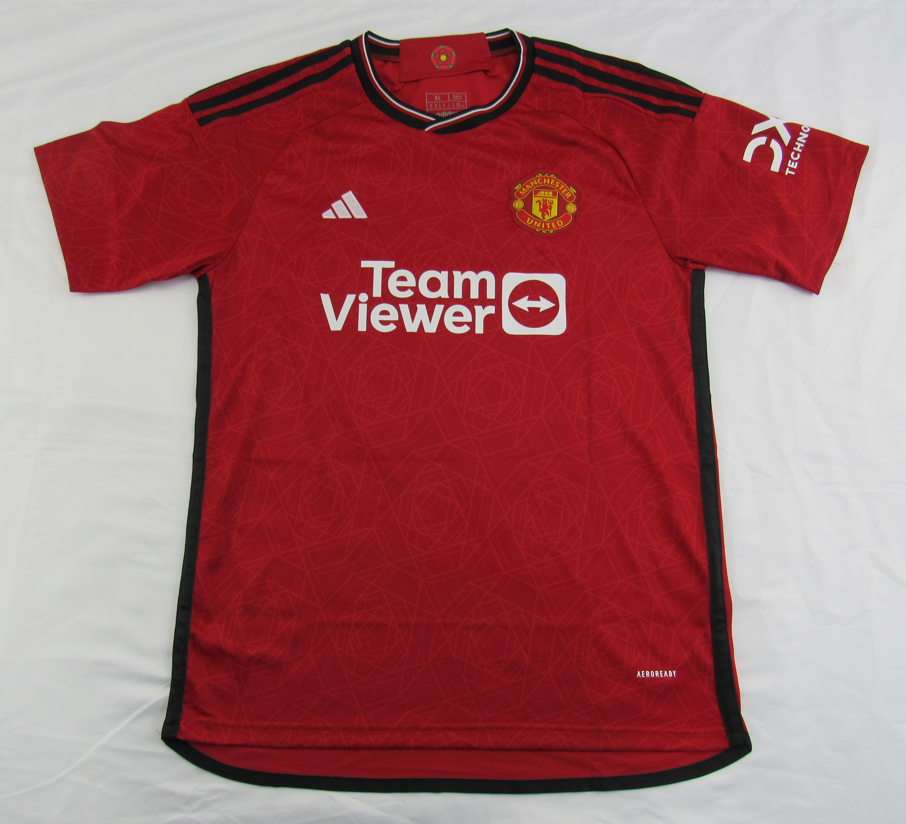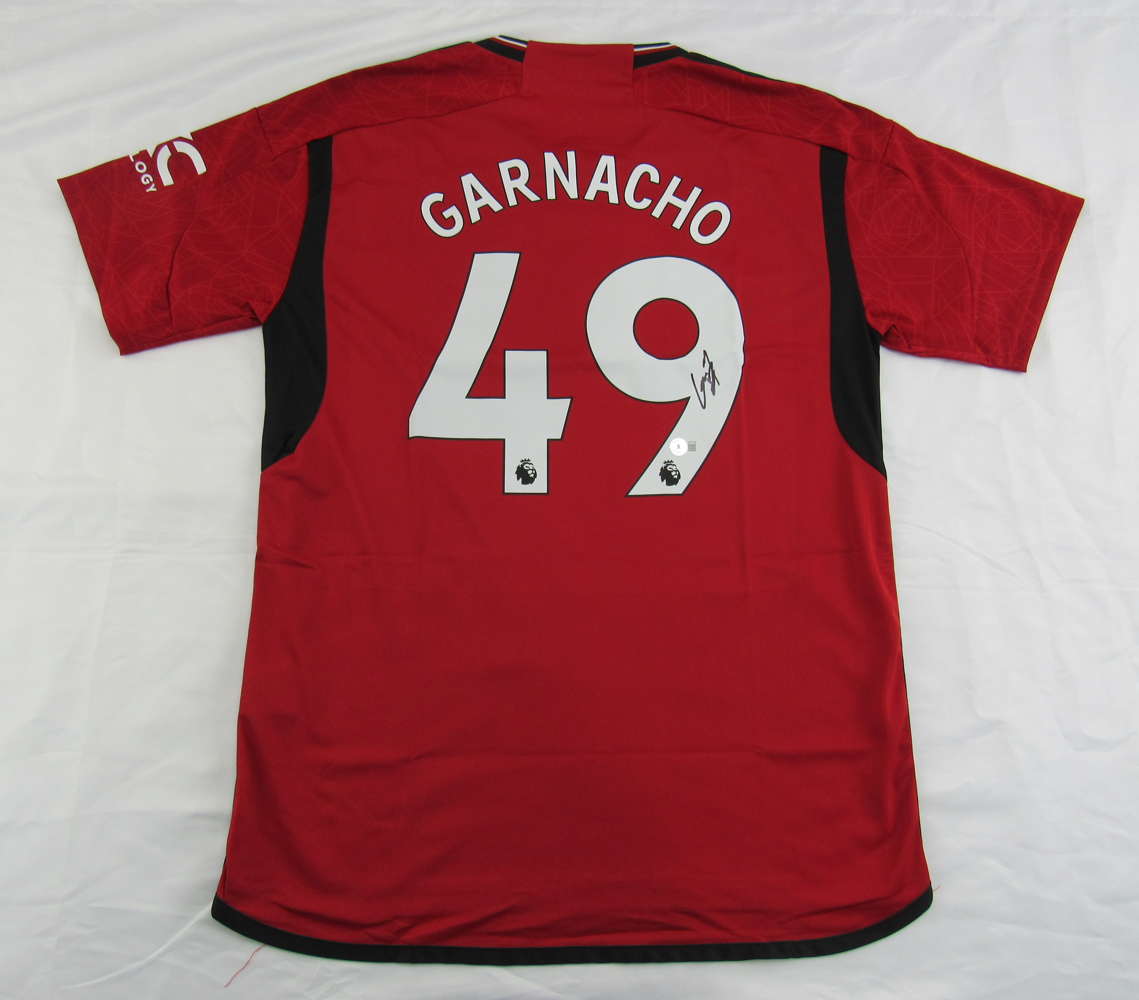 Adidas style jersey with everything pressed on, size XL. Hand-signed by Alejandro Garnacho. Please note, the signature is partially smudged.