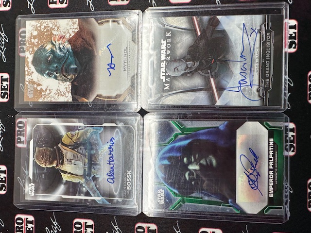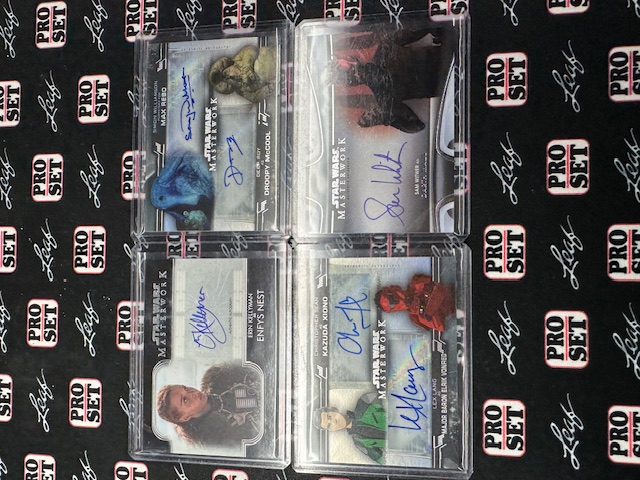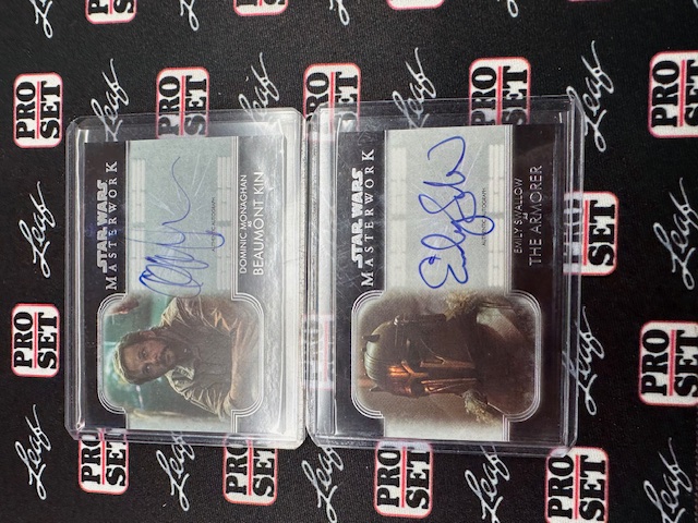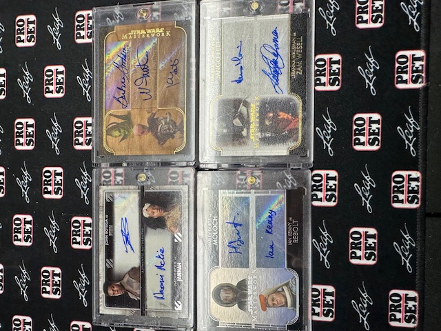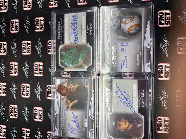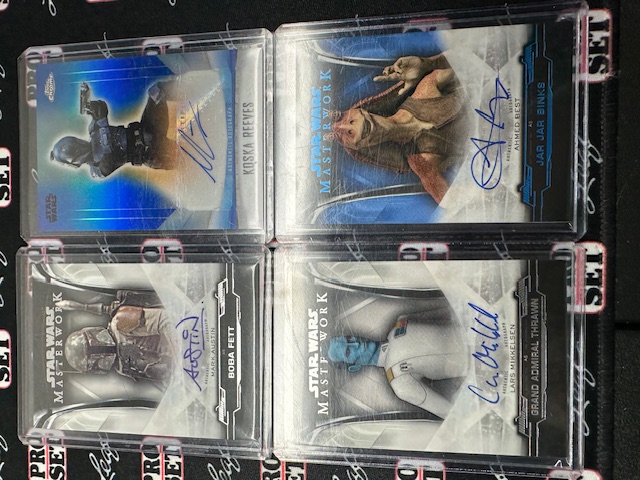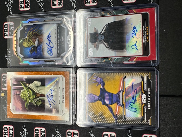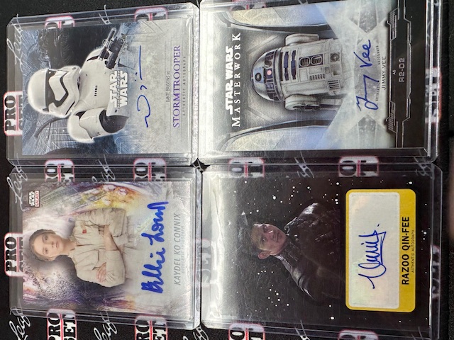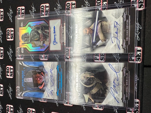 These packs feature some of the biggest names in the Star Wars universe, including Mark Austin (Boba Fett), Jimmy Vee (R2-D2), James Arnold Taylor (Obi-Wan Kenobi), Ahmed Best (Jar Jar Binks), Jeremy Bulloch (Boba Fett), Matthew Wood (General Grievous), Tom Kane (Yoda), Sam Witmer (Darth Maul), and others as shown in the pictures. These packs also include multi-autos, wood autos, refractor autos, and other parallels.