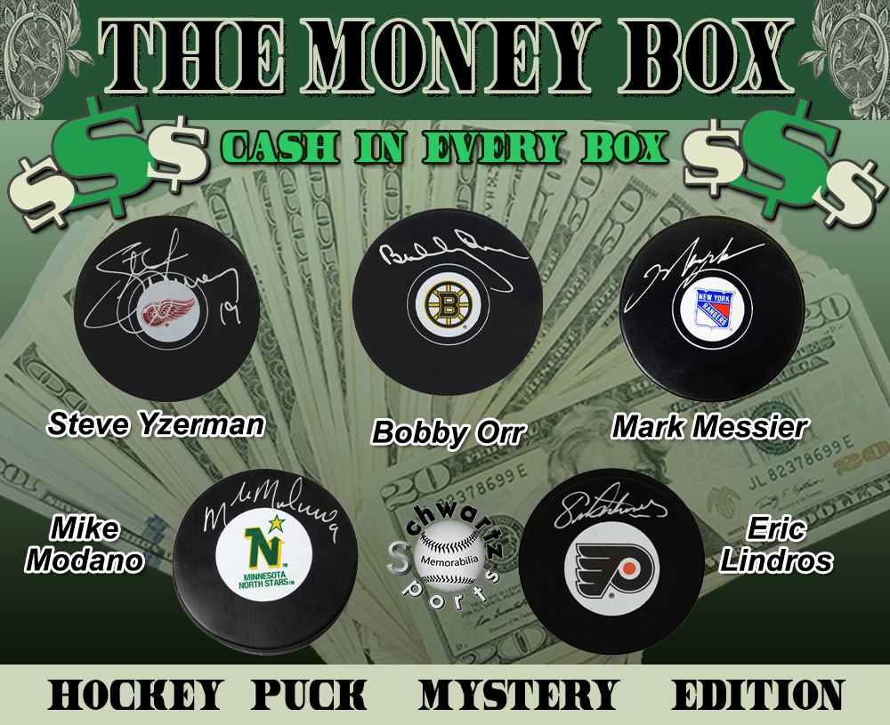 The Money Box – Hockey Hall of Fame Hockey Puck Edition includes one Hockey Hall of Famer autographed logo Hockey Puck in Every Box, AND as an added BONUS you will receive one Bill of United States Currency ($1, $2, $5, $10, $20, $50, or $100) - Bills of ALL of these Denominations are Included in this Series!!! There are 50 different Hockey Hall of Famers included in The Money Box (HOF Hockey Puck Edition) Series 1 Mystery Box, which is a Pristine Exclusive edition that is limited to 125 boxes.