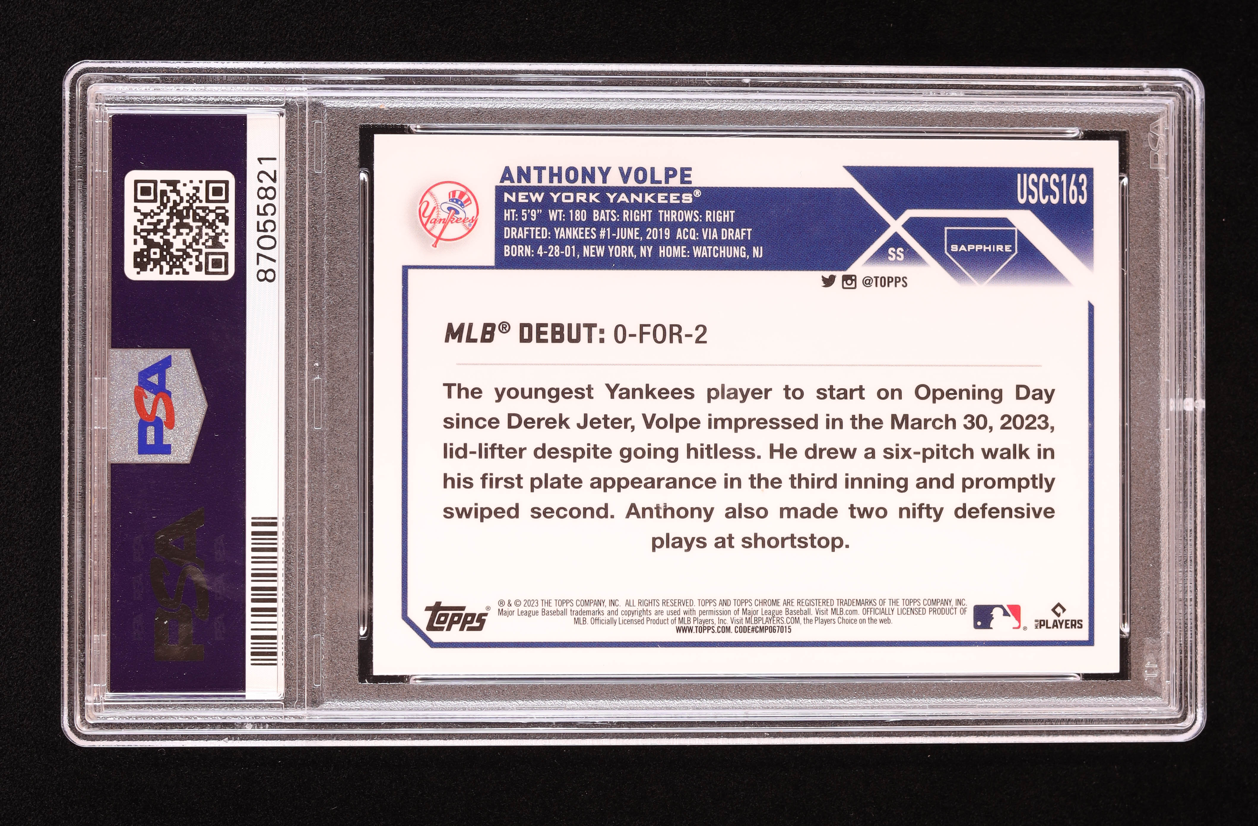 Anthony Volpe 2023 Topps Chrome Update Sapphire #USCS163 RD RC (PSA 10)