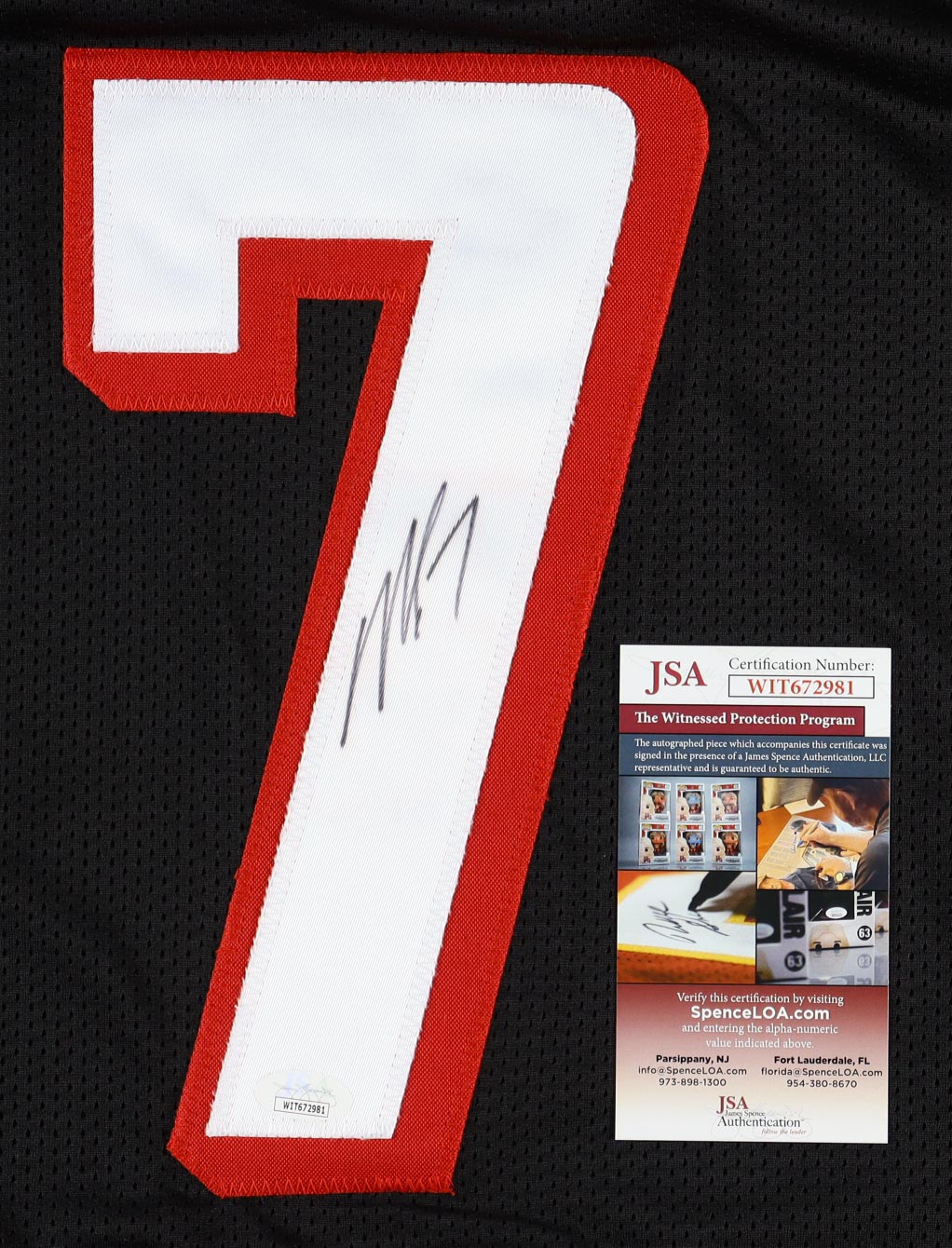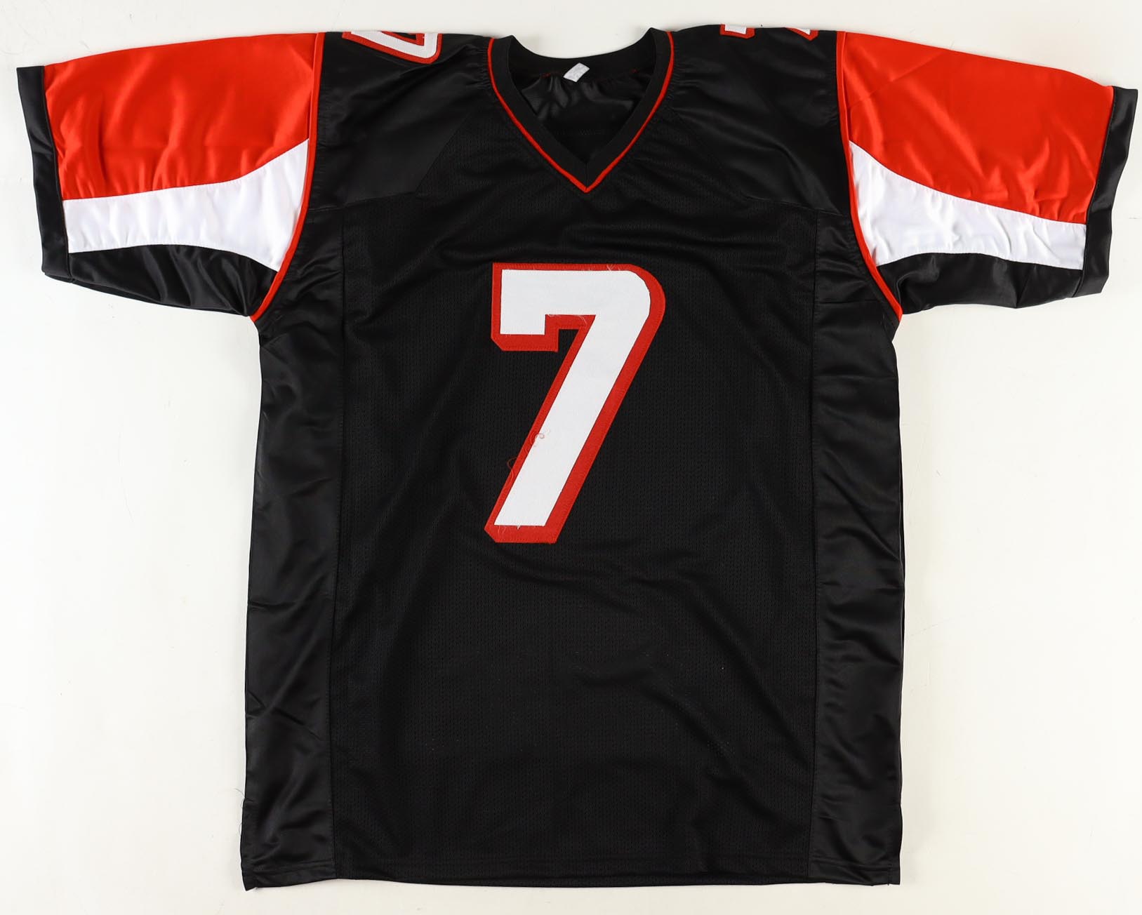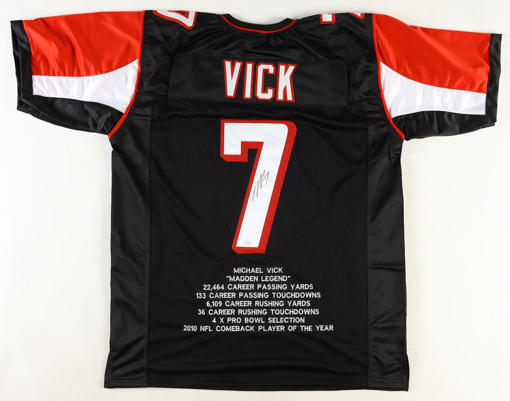 Custom jersey with everything sewn on, size XL. Hand-signed by Michael Vick. Vick's career highlight stats are custom stitched below the reverse number.