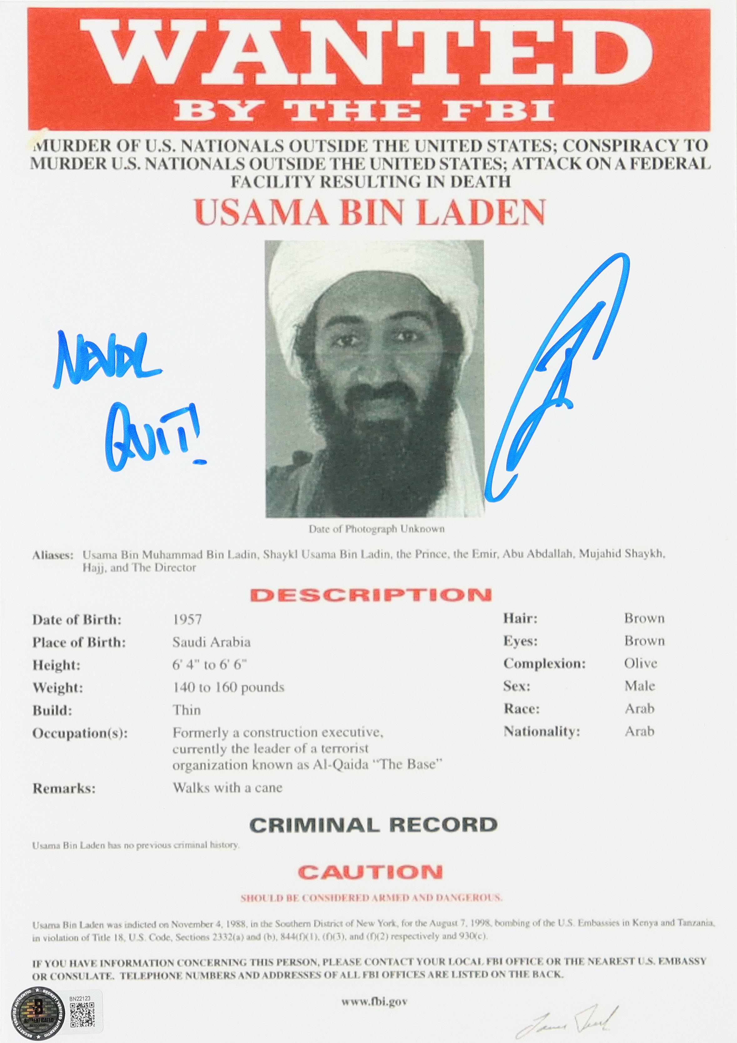 Robert O’Neill Signed Usama Bin Laden Wanted Poster 8.5x12 Photo Inscribed “Never Quit!” (Beckett)