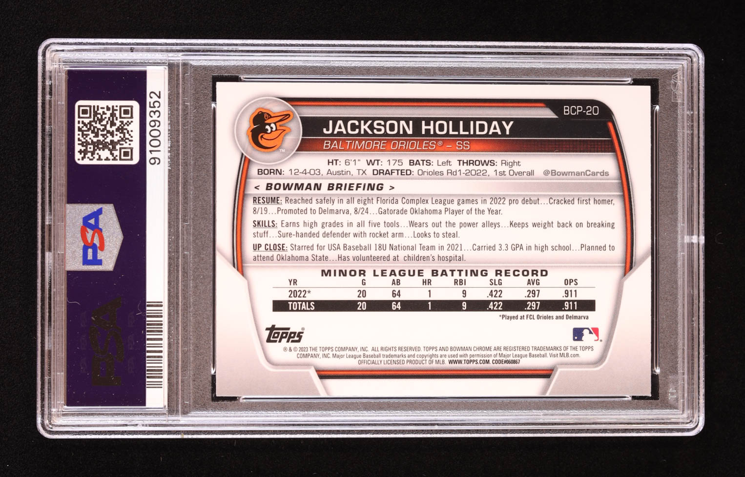 Jackson Holliday 2023 Bowman Chrome Mega Box Prospects #BCP20 RC (PSA 10)