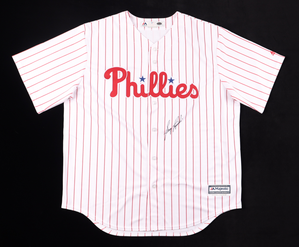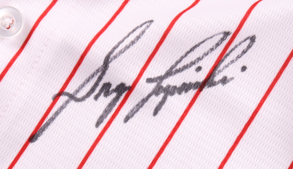 Majestic jersey. Everything is pressed on, size XL. Hand-signed by Greg Luzinski (Philadelphia Phillies).