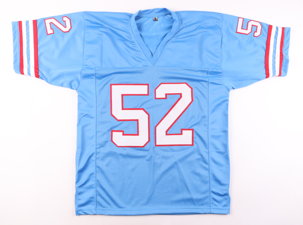 Custom jersey with everything sewn on, size XL. Hand-signed and inscribed by Robert Brazile (HOF). Please note, the signature has bled.