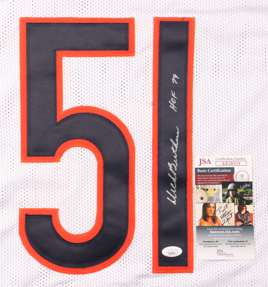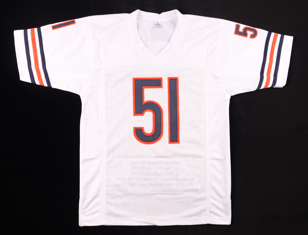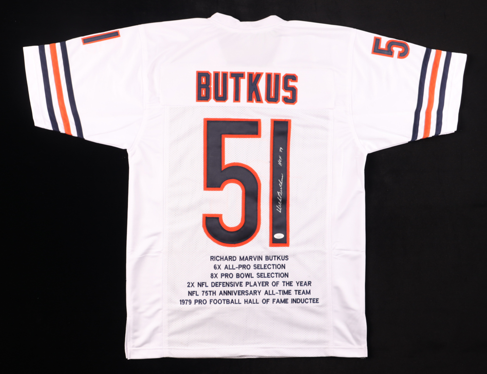 Custom on-field style jersey. Everything is sewn on, size XL. Hand-signed and inscribed by Dick Butkus (D. 2023, HOF). Butkus's career stats have been custom stitched in the jersey below the reverse numbers.