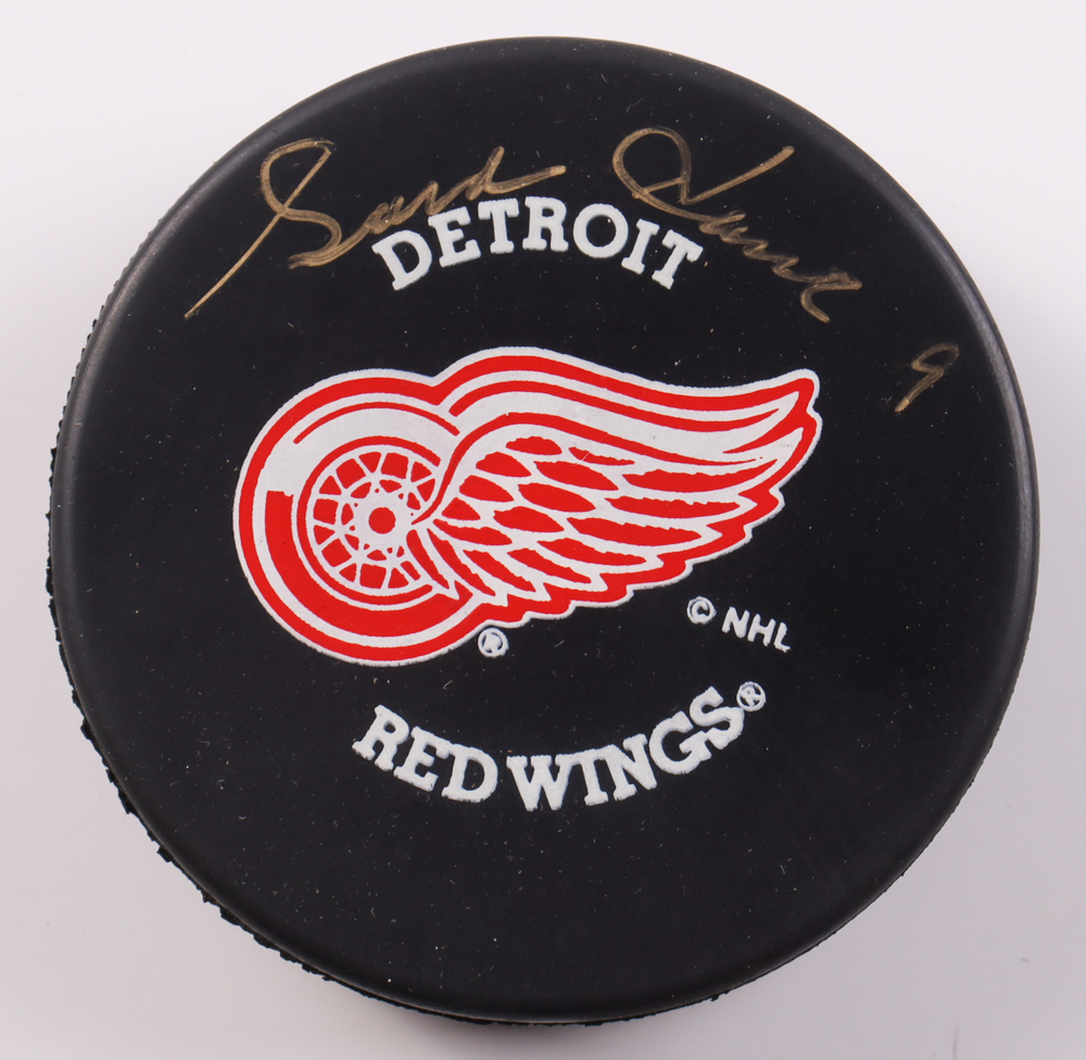 Detroit Red Wings logo hockey puck has been hand-signed by Gordie Howe (D. 2016, HOF).