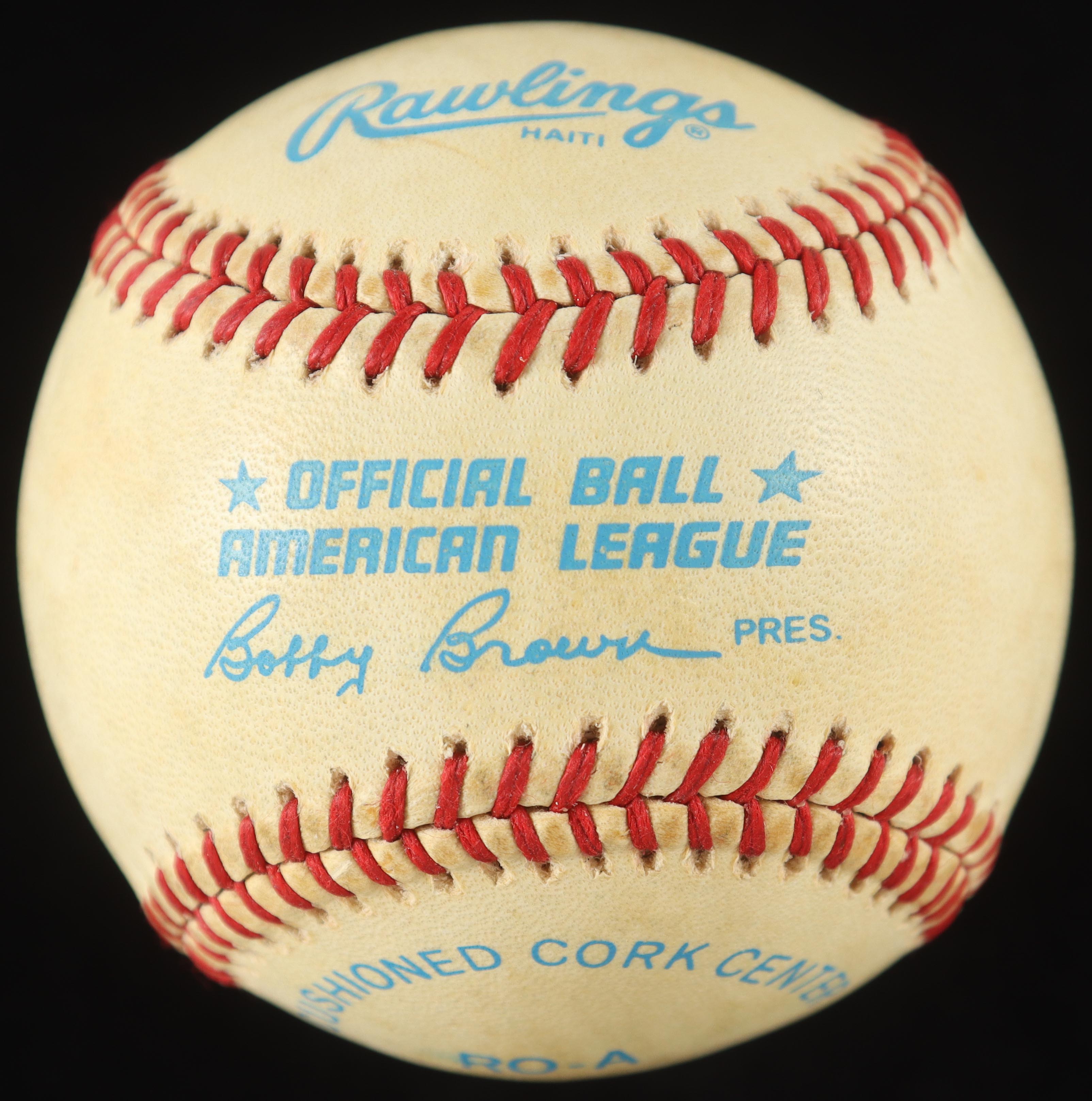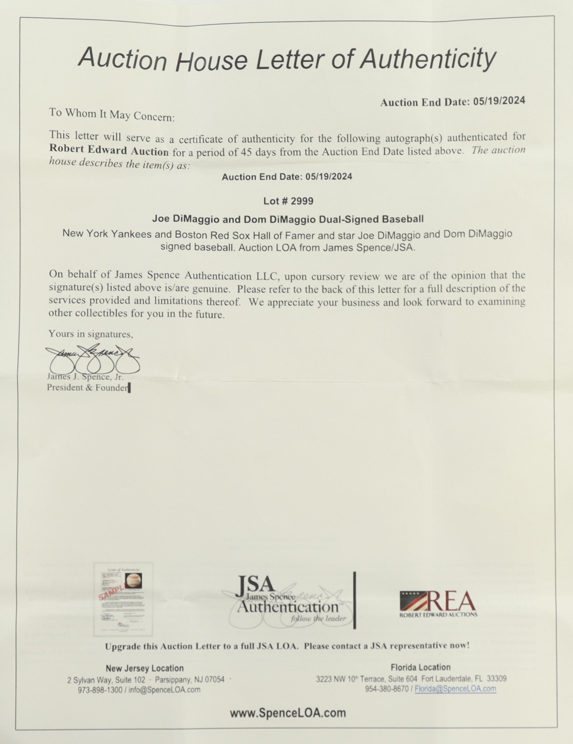 Rawlings Official American League baseball. Hand-signed by Joe DiMaggio (D. 1999, New York Yankees, HOF) and Dom DiMaggio (D. 2009, Boston Red Sox). Please note, the baseball shows signs of natural toning. Includes display case as shown.