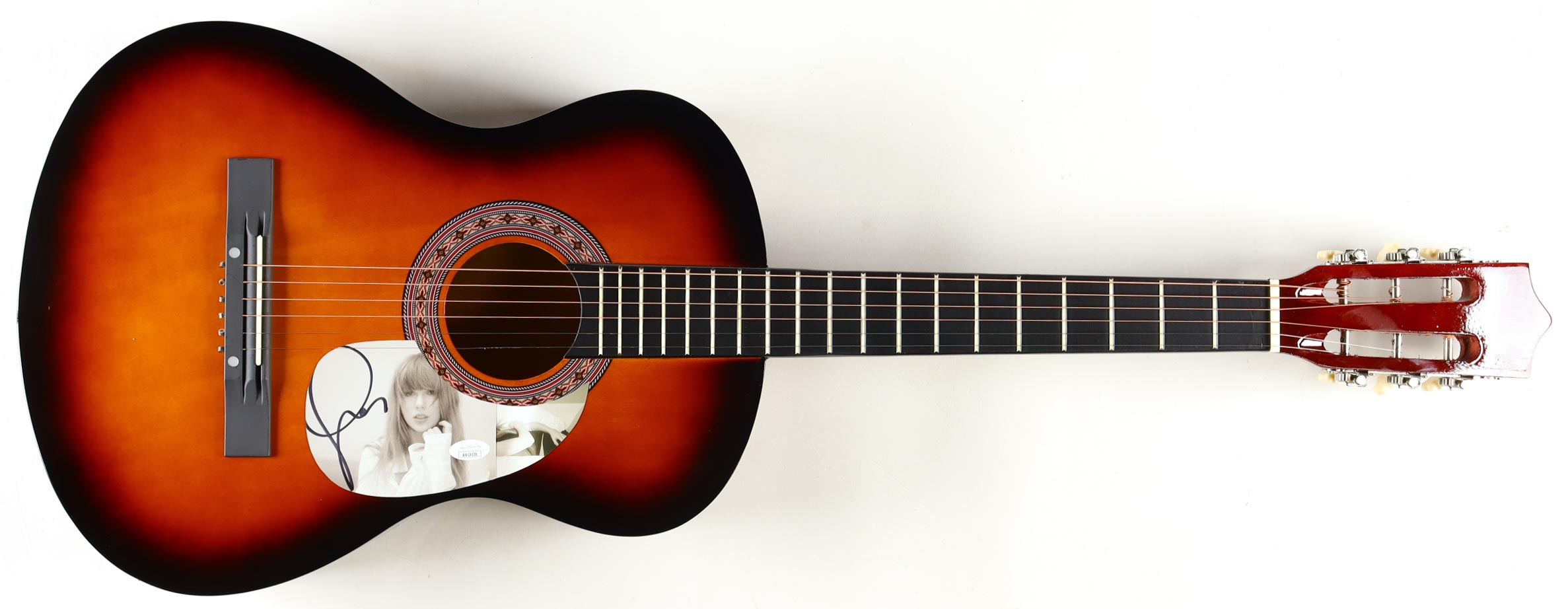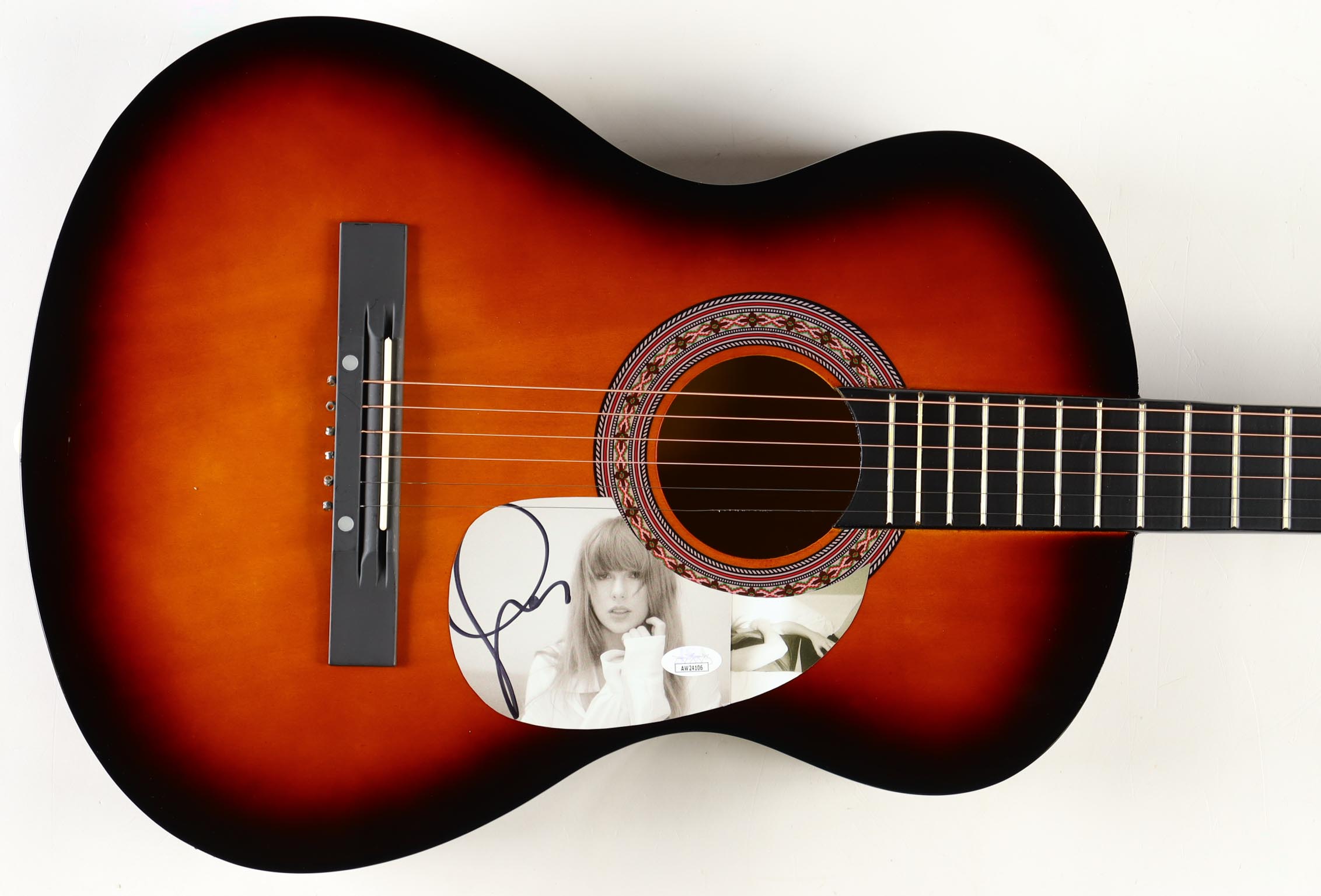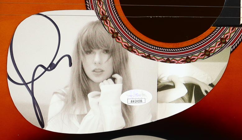 Acoustic guitar measures approximately 37" in length and has been hand-signed on a "The Tortured Poets Department" CD cover that has been repurposed as a pick-guard by Taylor Swift.