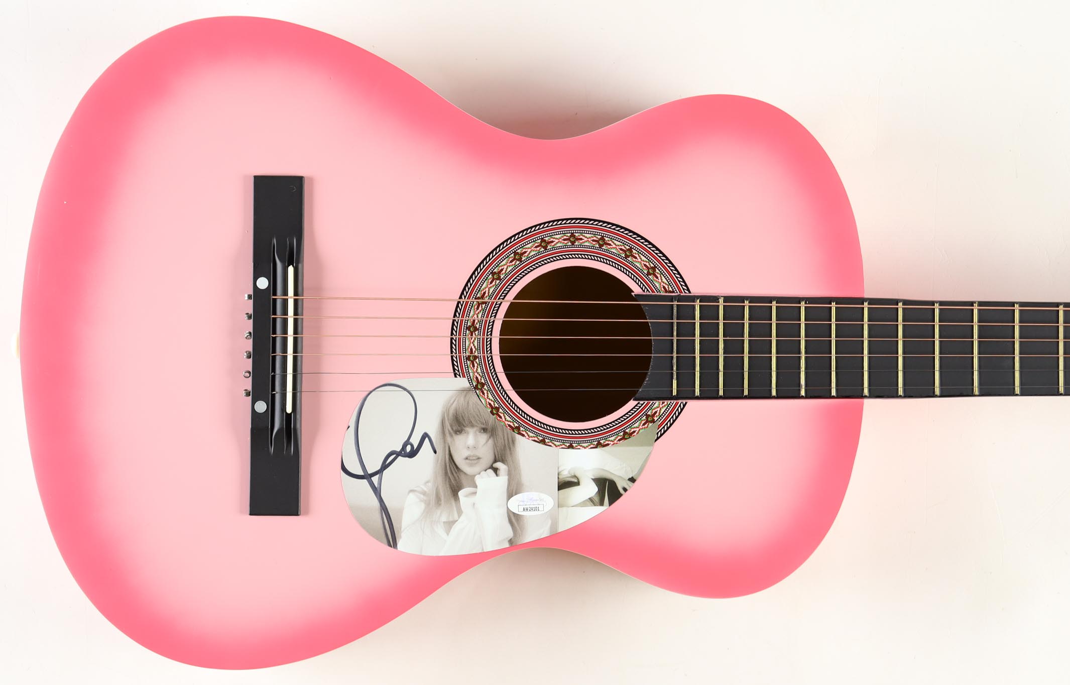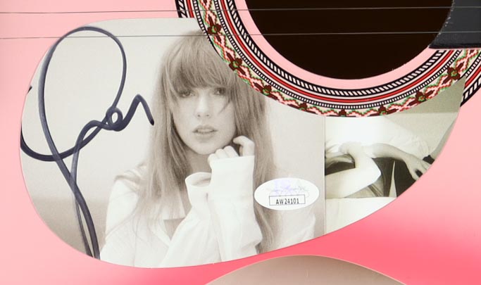 Acoustic guitar measures approximately 37" in length and has been hand-signed on a "The Tortured Poets Department" CD cover that has been repurposed as a pick-guard by Taylor Swift.
