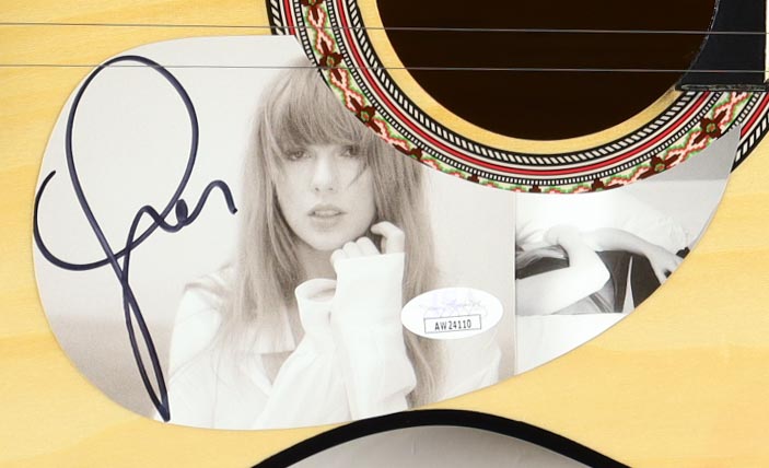 Acoustic guitar measures approximately 38" in length and has been hand-signed on a "The Tortured Poets Department" CD cover that has been repurposed as a pick-guard by Taylor Swift.