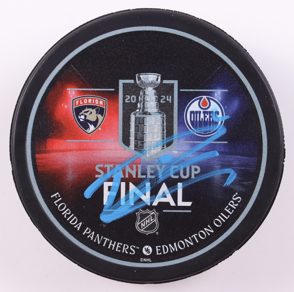 2024 Stanley Cup Final logo official game hockey puck. Hand-signed by Leon Draisaitl (Edmonton Oilers).