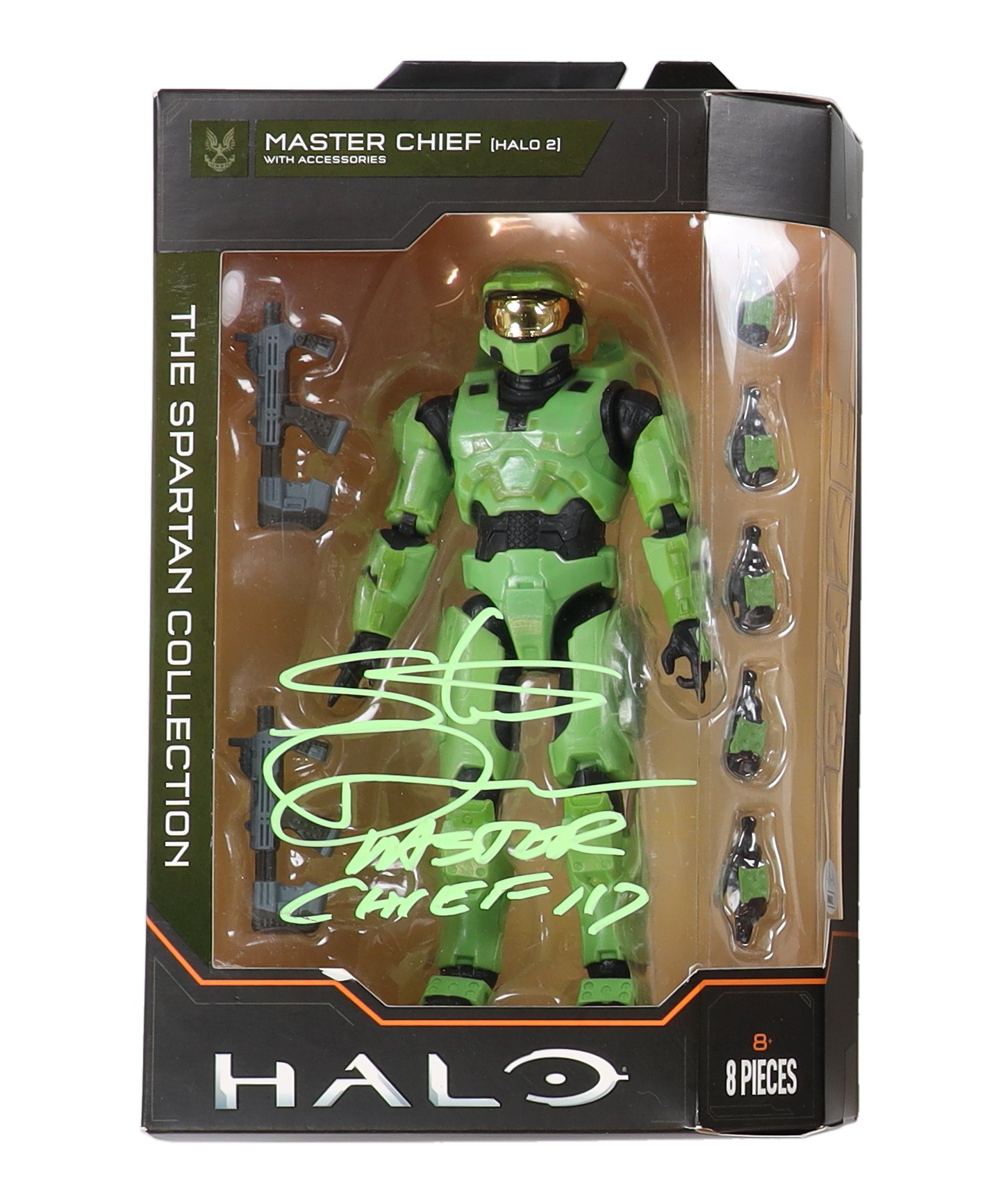 Figure measures approximately 8" tall and comes in the original box. Hand-signed and inscribed by Steve Downes (Master Chief).