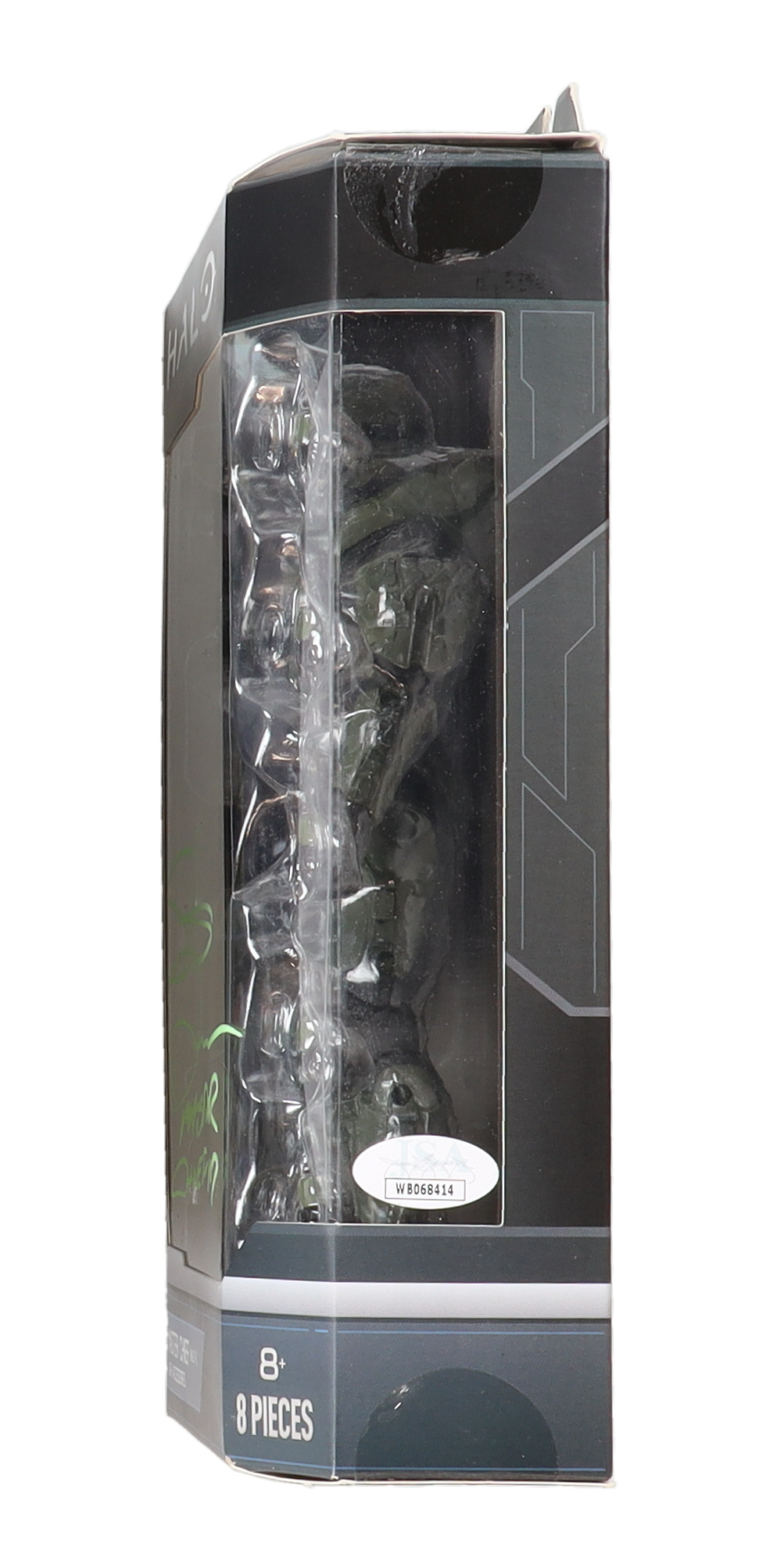 Figure measures approximately 8" tall and comes in the original box. Hand-signed and inscribed by Steve Downes (Master Chief).