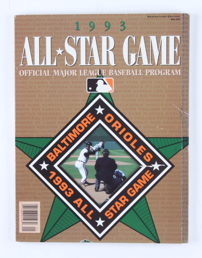1993 Baltimore Orioles All-Star Game newstand edition program. Please note, the program has been torn on the front cover and has some corner and edge wear.