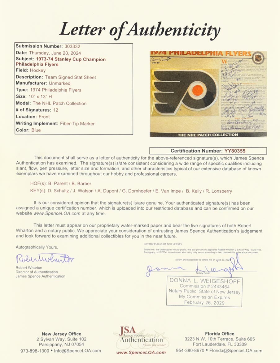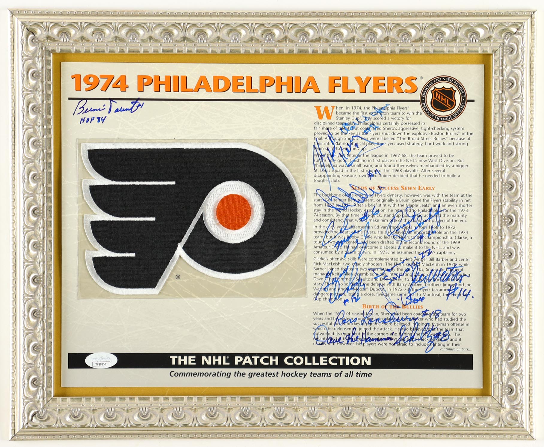 Custom frame measures 13" x 16" in size. Features a uniform patch card that has been hand-signed and inscribed by (12) including Bernie Parent, Bill Barber, Dave Schultz, Joe Watson, André Dupont, Gary Dornhoefer, Ed Van Impe, Bob Kelly, and Ross Lonsberry with (3) unknown.