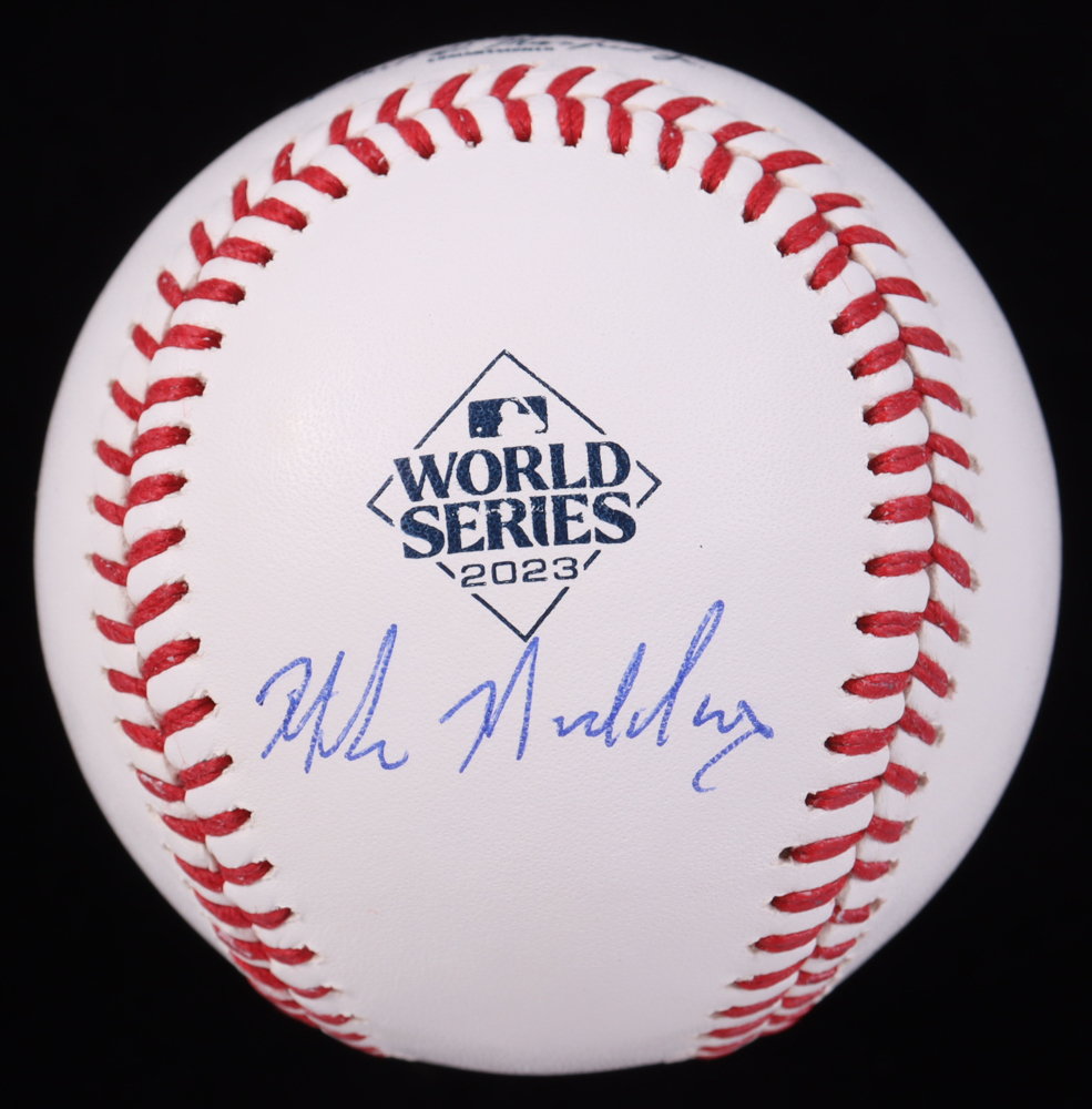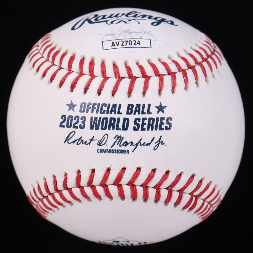 Rawlings Official 2023 World Series Logo baseball has been hand-signed by Mike Maddux (Texas Rangers).