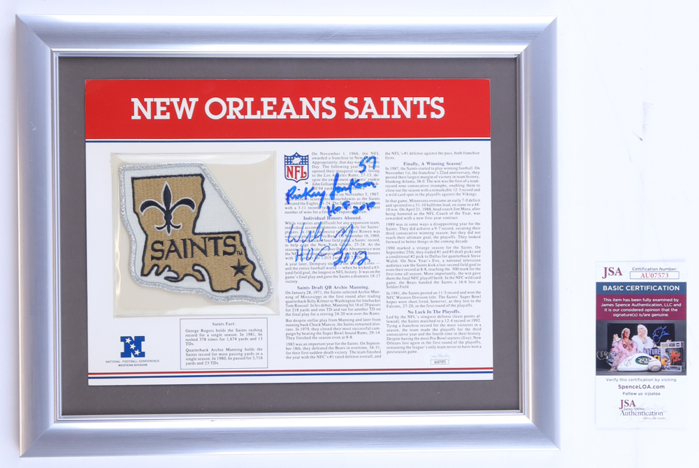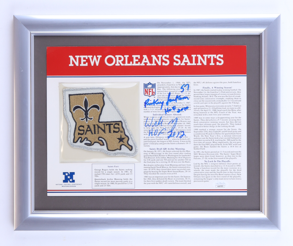 Willie Roaf & Rickey Jackson Signed Saints Commemorative Stat Card With Cloth Uniform Patch Custom Framed Display Inscribed "HOF 2012" & "HOF 2010" (JSA)