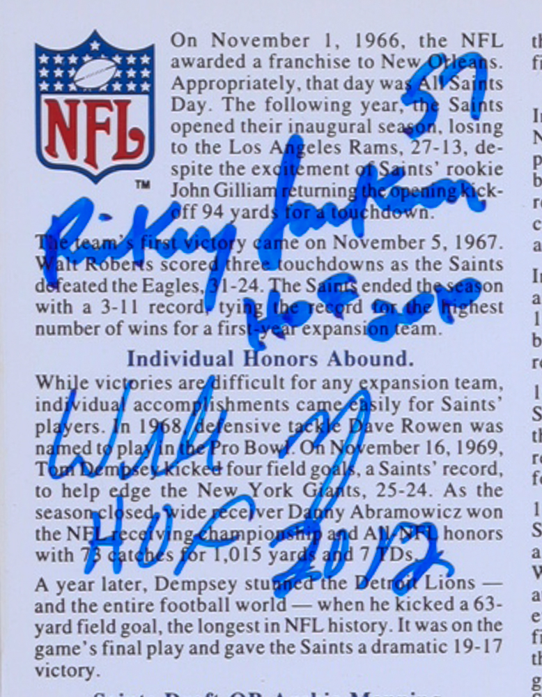 Custom Framed Display measures approximately 13" x 16" in dimension and features a New Orleans Saints Commemorative Stat Card that has been hand-signed and inscribed by Willie Roaf (HOF) and Rickey Jackson (HOF). Please note, there is some scuffing on the display.