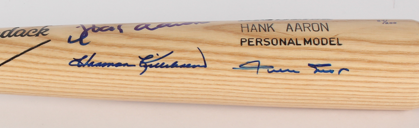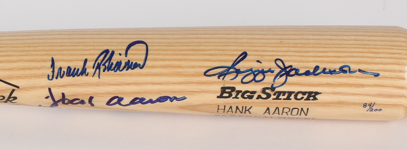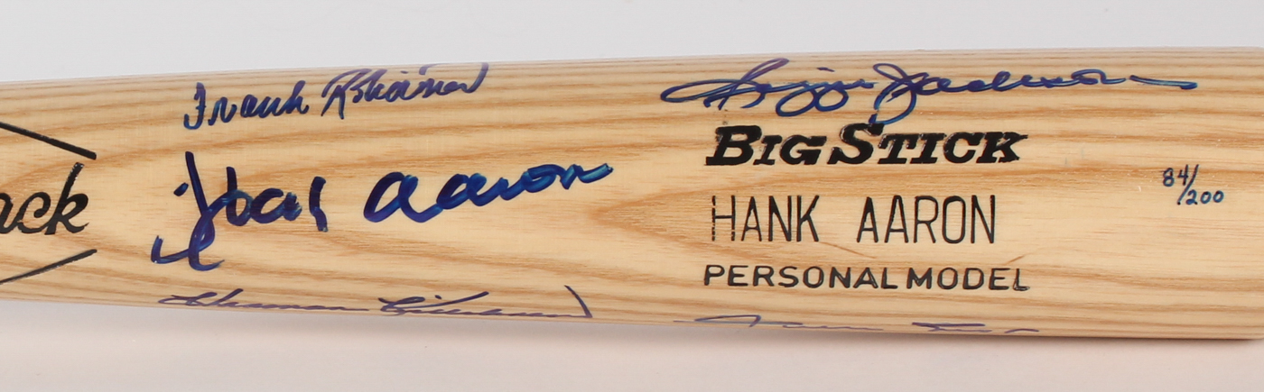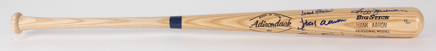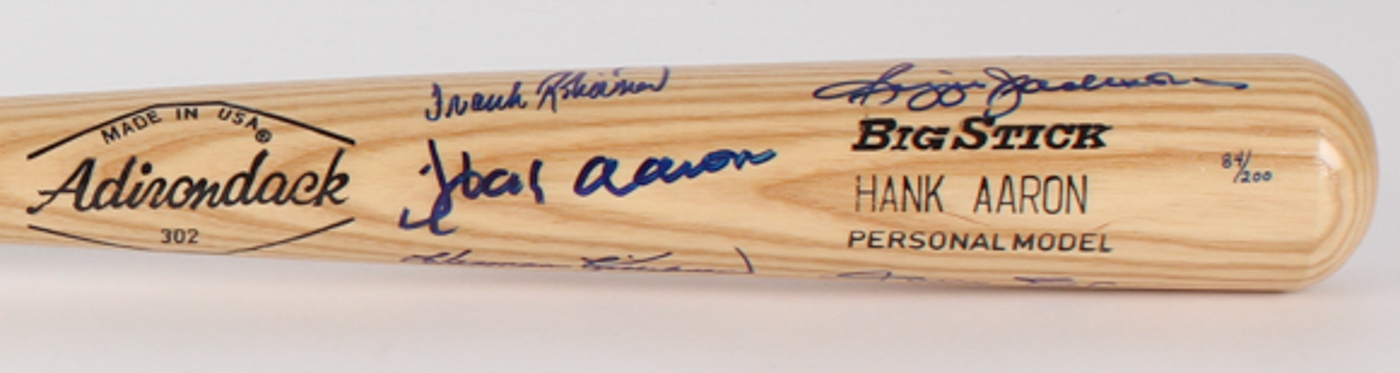 Full-Size Adirondack No. 302 "Big Stick" Hank Aaron Personal Model Baseball Bat. Bat has been hand-signed in blue felt-tip pen by Hank Aaron (755 HR, Braves, HOF), Willie Mays (660 HR, Giants, HOF), Frank Robinson (586 HR, Reds, HOF), Harmon Killebrew (573 HR, D. 2011, Twins, HOF) and Reggie Jackson (563 HR, Athletics, HOF). Baseball bat is limited edition and has been hand-numbered in blue felt-tip pen 84/200.