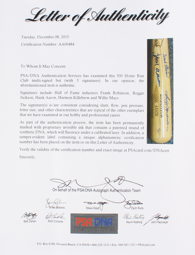 500 Home Run Club LE Baseball Bat Signed by (5) with Hank Aaron, Willie Mays, Frank Robinson, Harmon Killebrew & Reggie Jackson - Limited Edition #84/200 (PSA LOA)