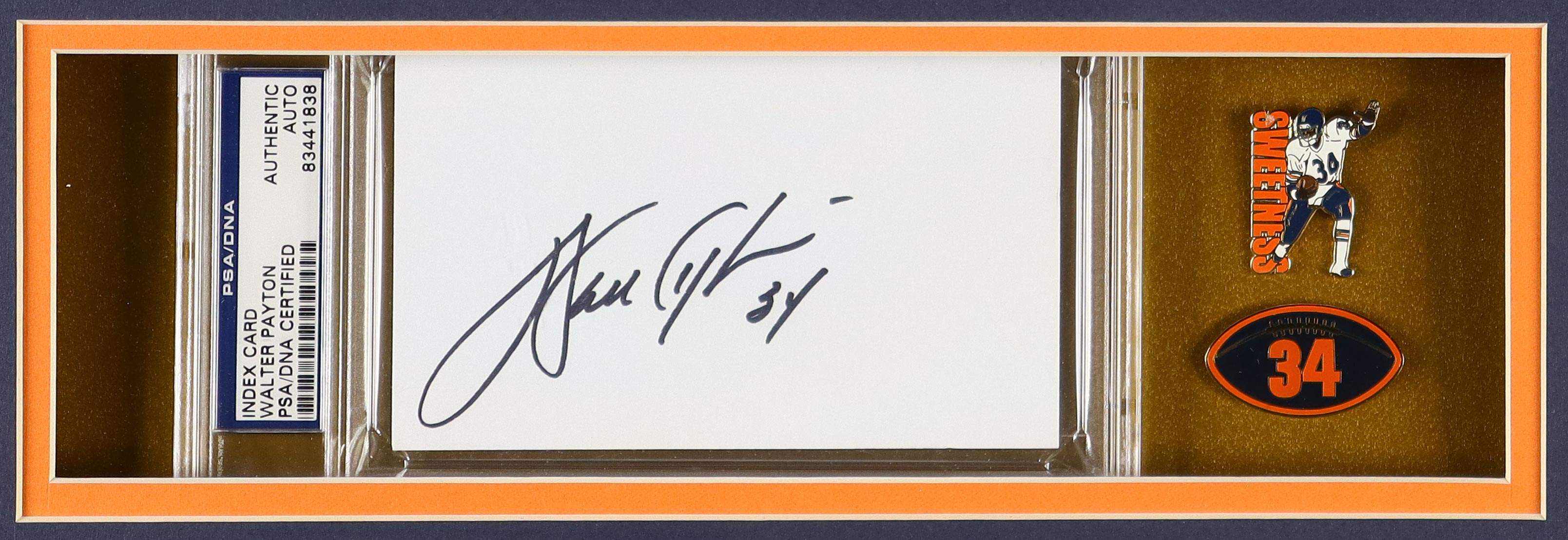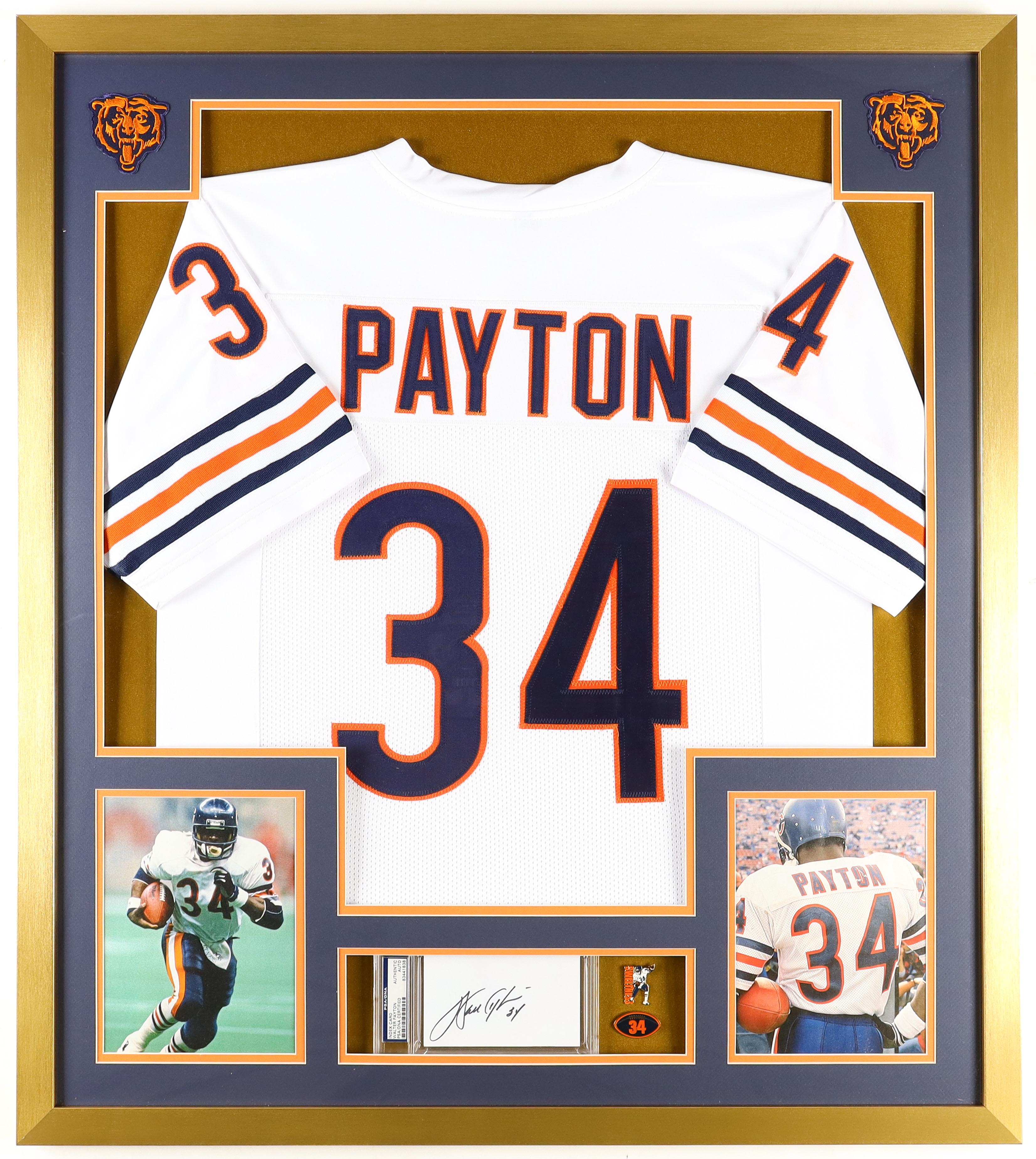 Walter Payton Signed Custom Framed Cut Display with Jersey, (2) Payton Pins & (2) Logo Cloth Patches (PSA)
