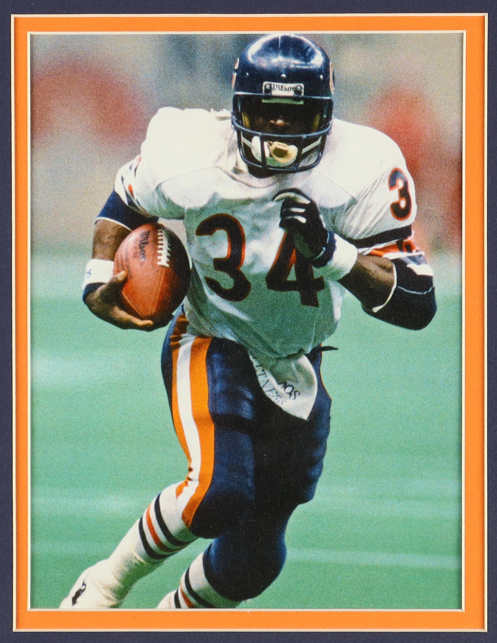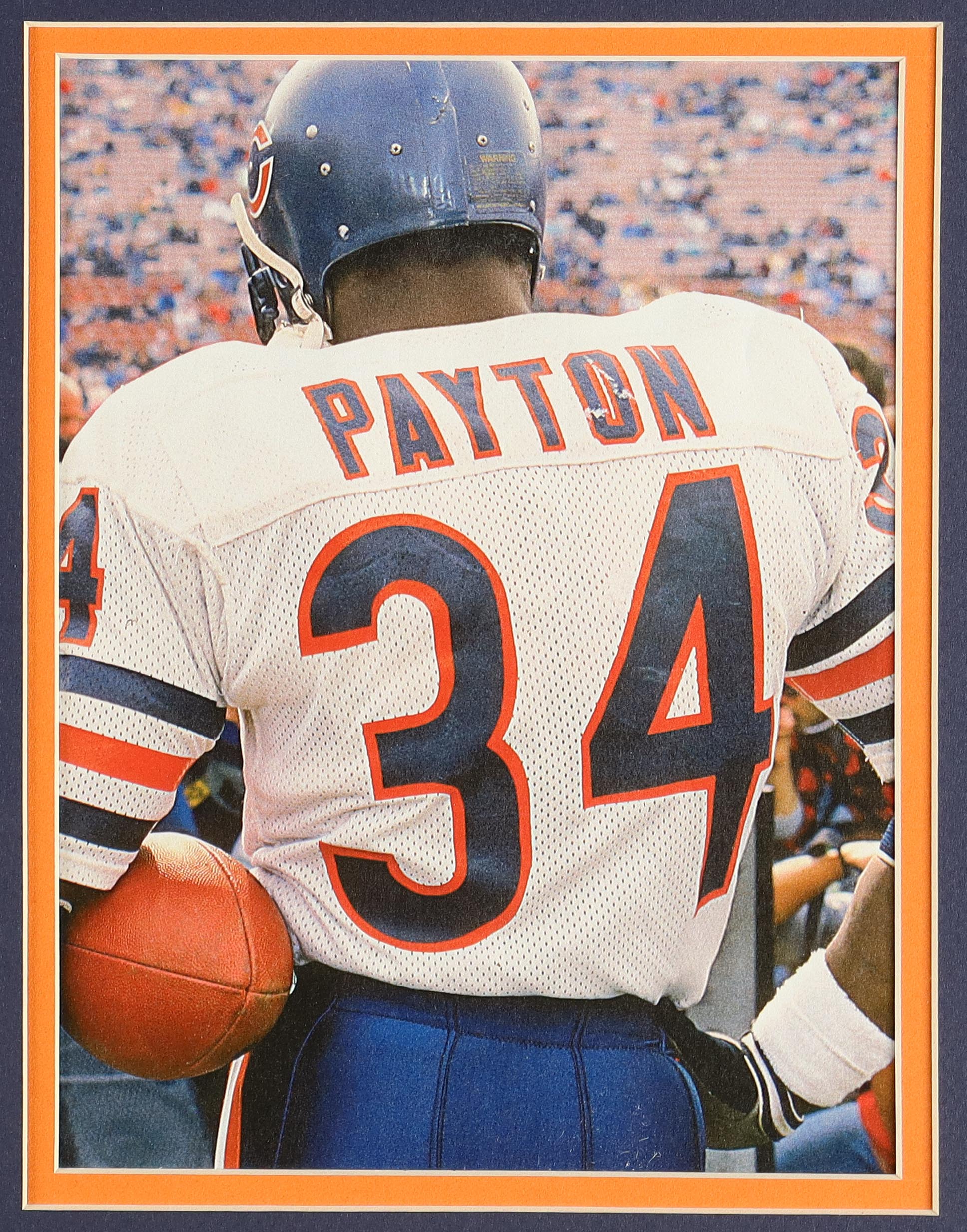 Custom frame measures approximately 32" x 36" in size and features a cut that has been hand-signed by Walter Payton (D. 1999, Chicago Bears, HOF). The display also includes an unsigned jersey, (2) Walter Payton Pins, and (2) cloth logo patches.