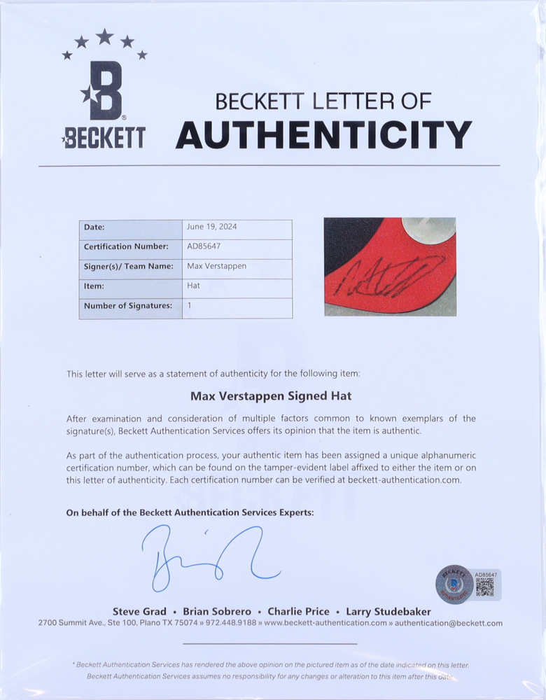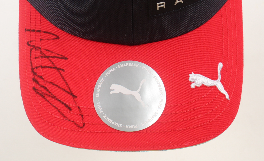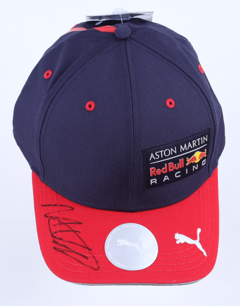 Redbull Racing Puma logo hat has been hand-signed by Max Verstappen.